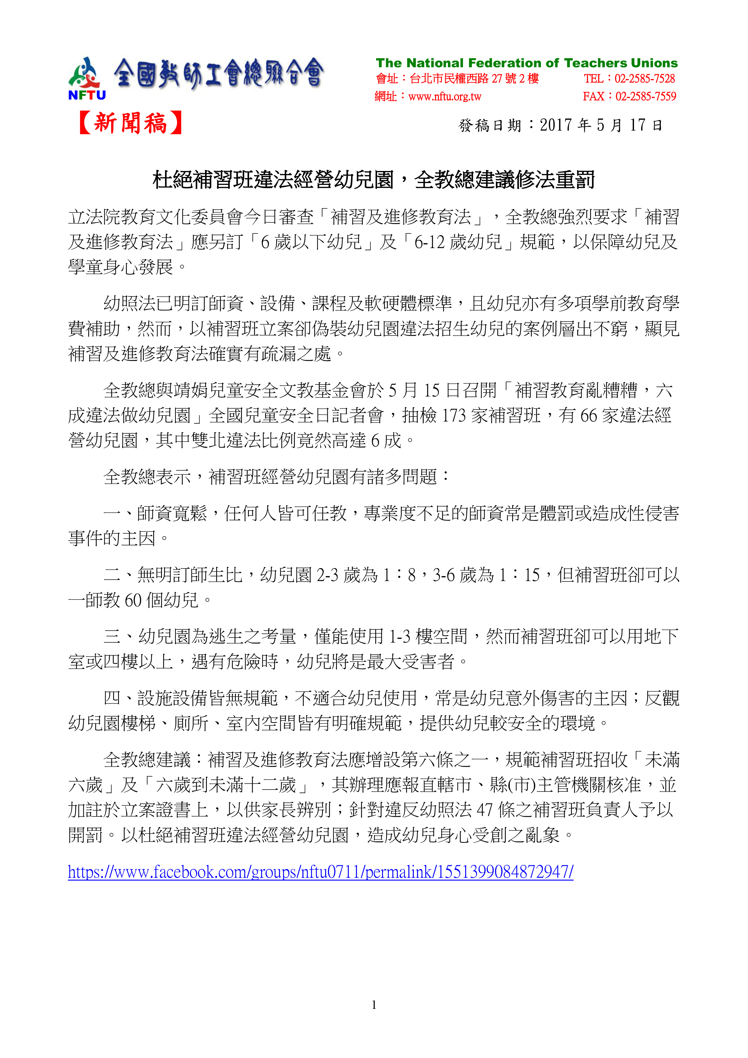 20170517【新聞稿】杜絕補習班違法經營幼兒園,全教總建議修法重罰