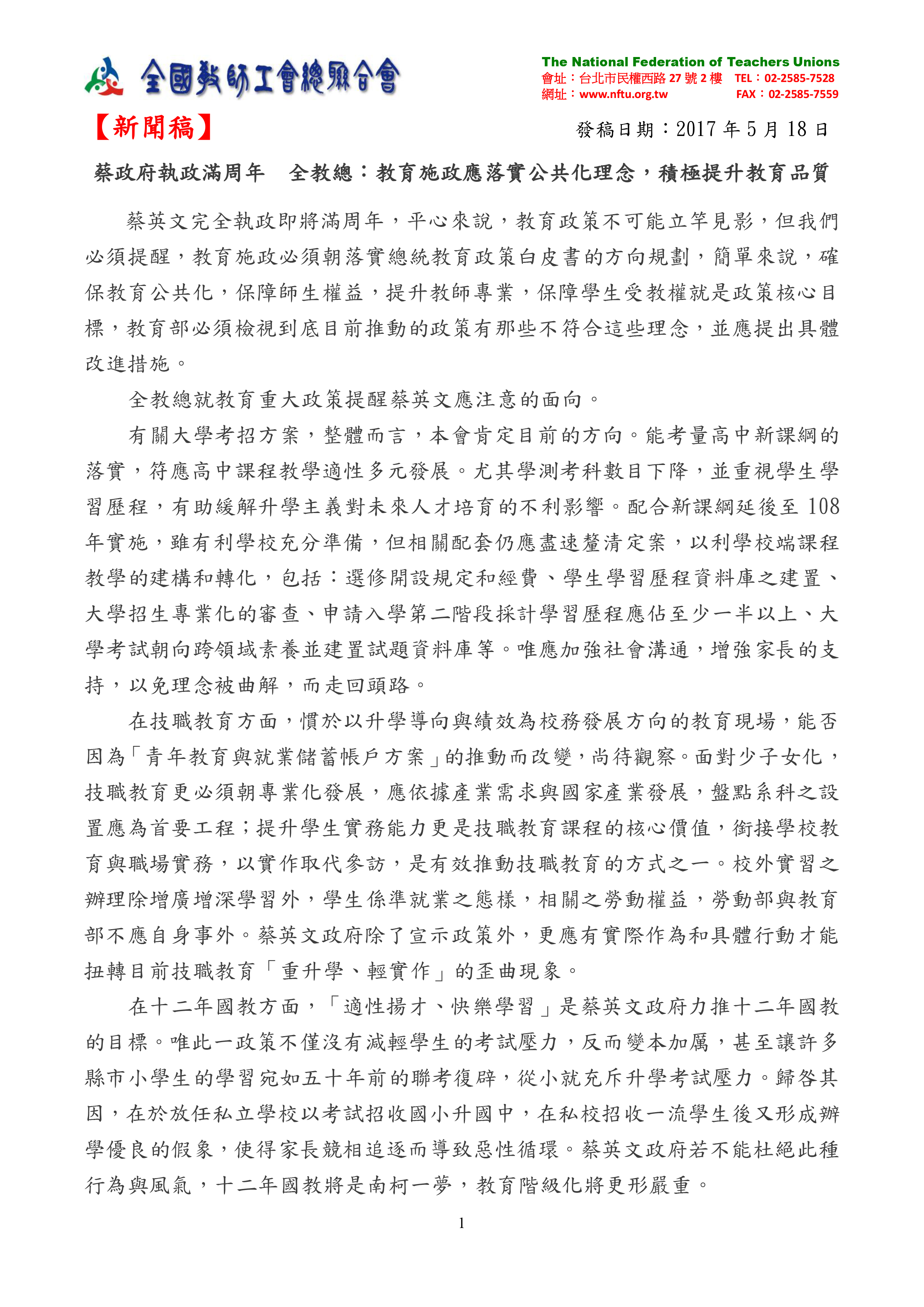 20170518【新聞稿】蔡政府執政滿周年 全教總:教育施政應落實公共化理念,積極提升教育品質