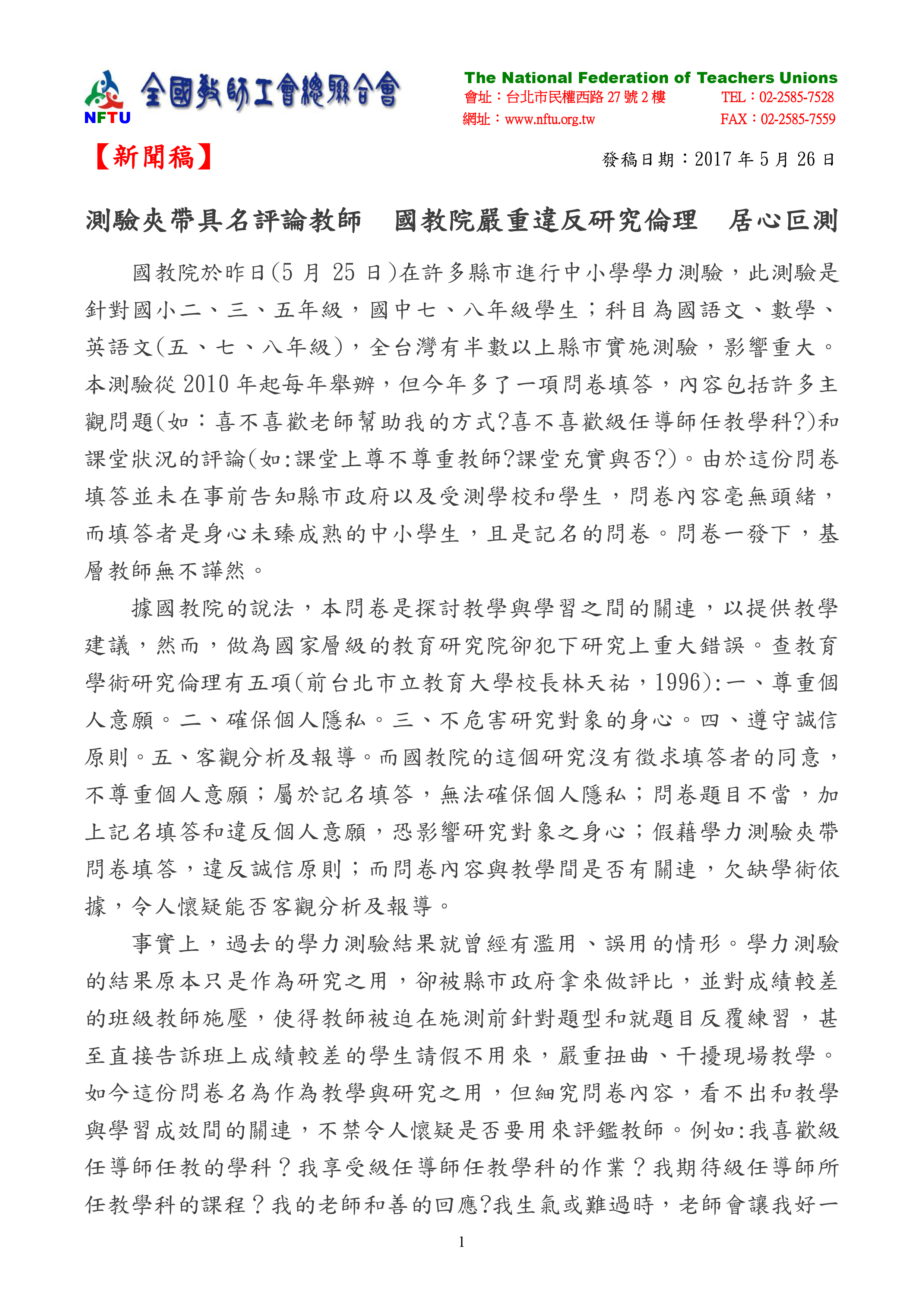 20170526【新聞稿】測驗夾帶具名評論教師 國教院嚴重違反研究倫理 居心叵測