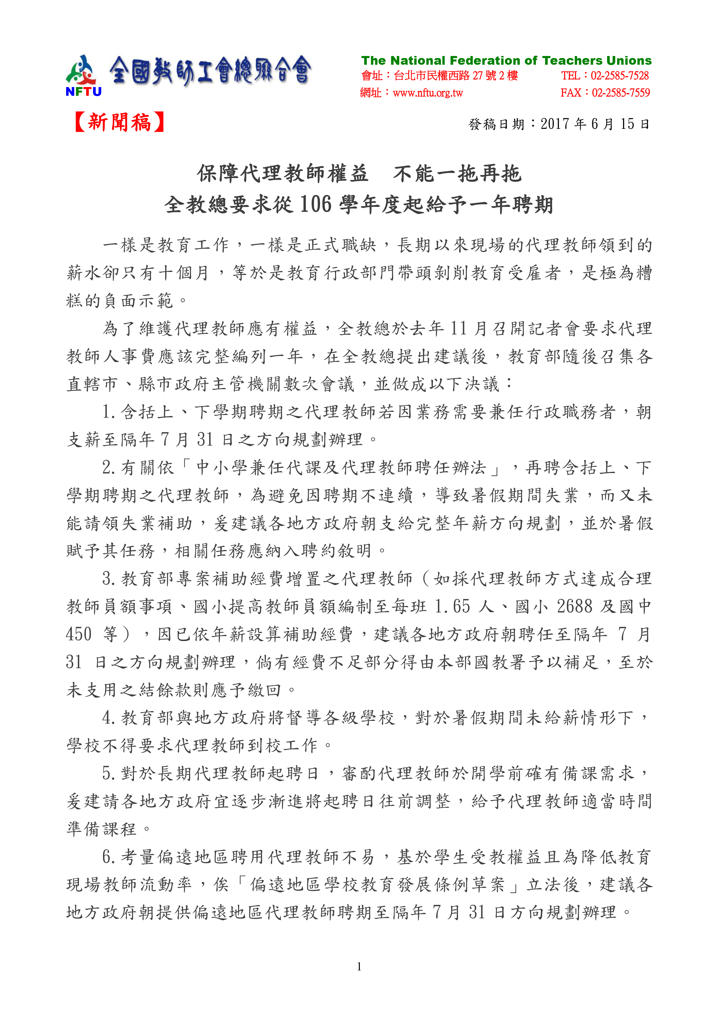 20170615【新聞稿】保障代理教師權益 不能一拖再拖 全教總要求從106學年度起給予一年聘期
