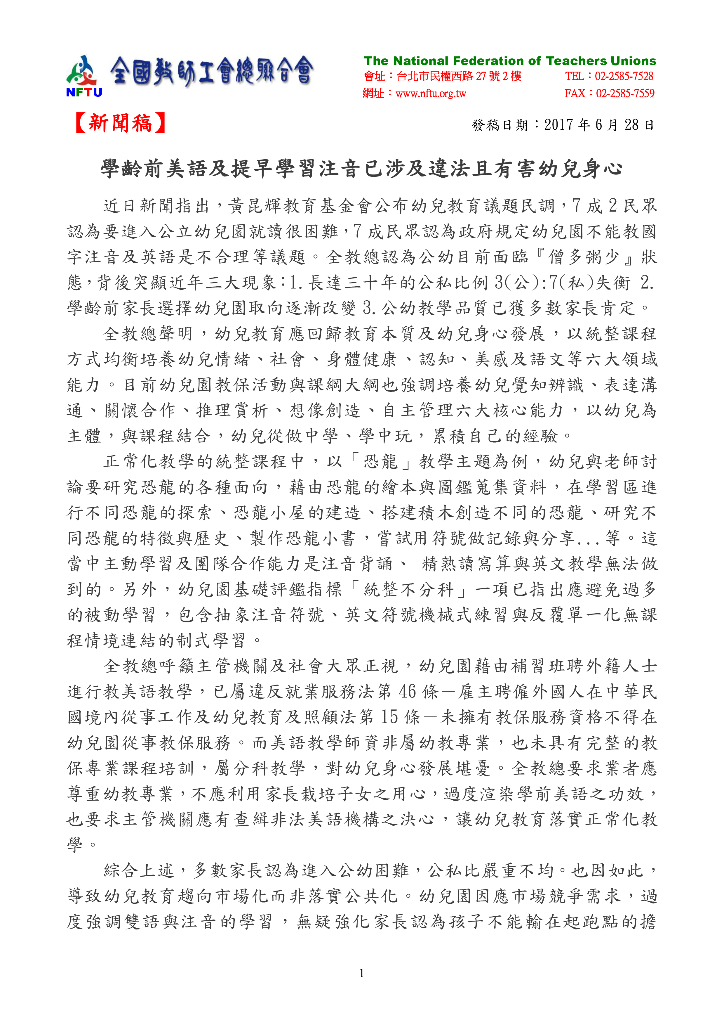 20170628【新聞稿】學齡前美語及提早學習注音已涉及違法且有害幼兒身心