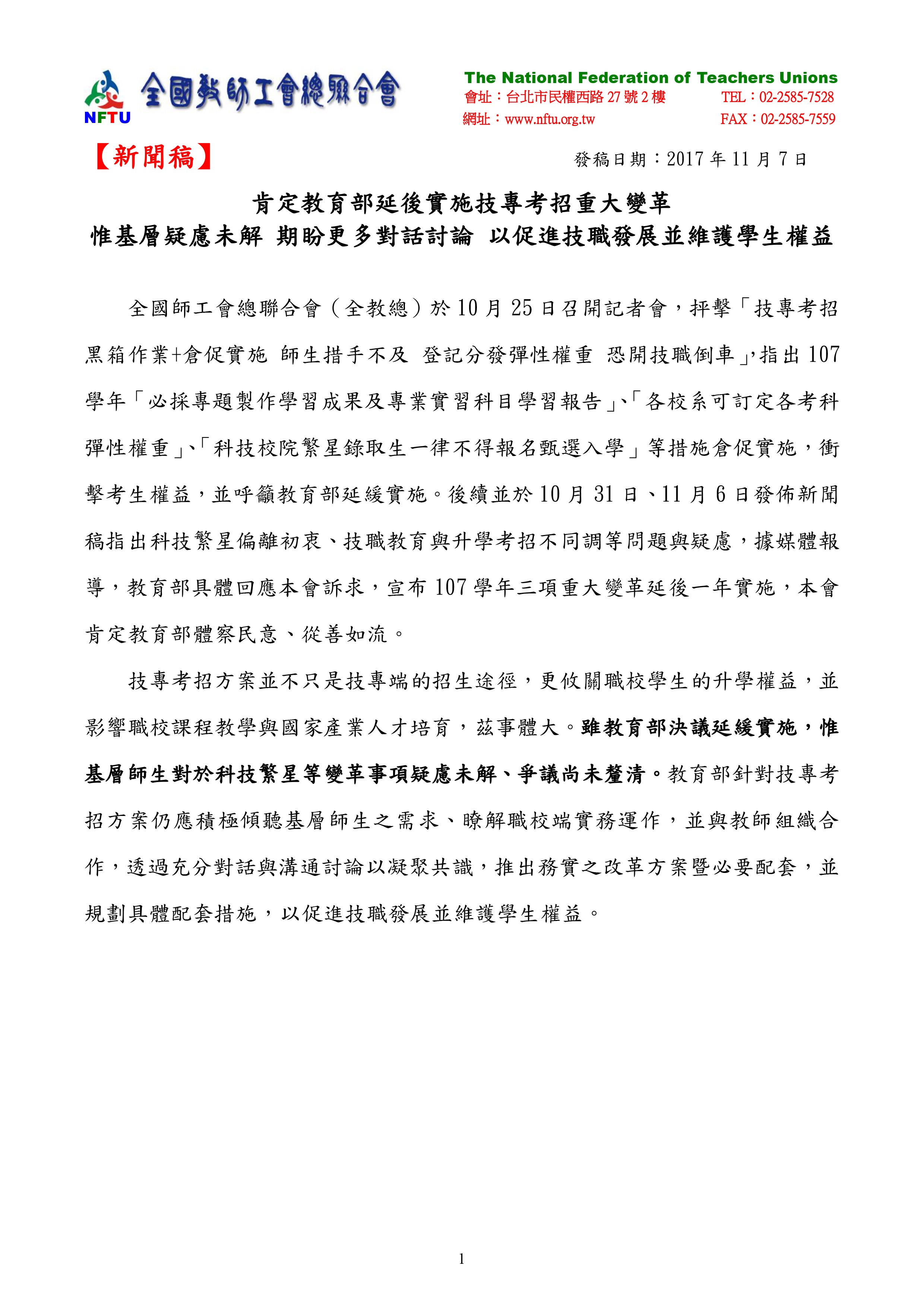 20171107【新聞稿】肯定教育部延後實施技專考招重大變革 惟基層疑慮未解 期盼更多對話討論 以促進技職發展並維護學生權益