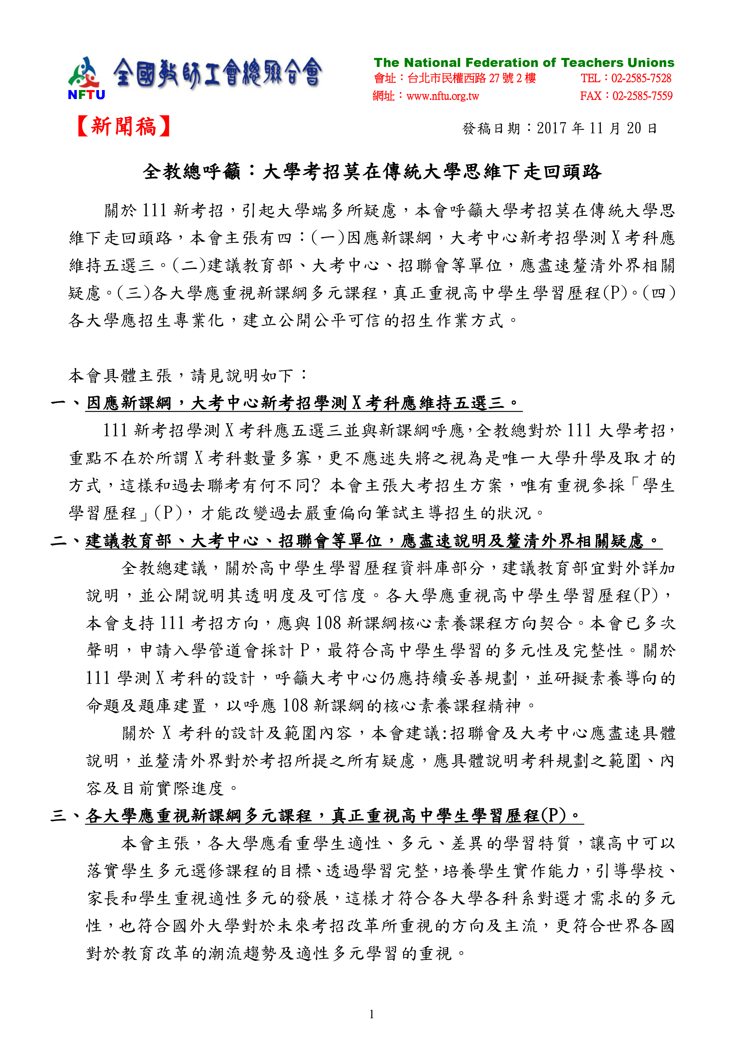 20171120【新聞稿】全教總呼籲:大學考招莫在傳統大學思維下走回頭路