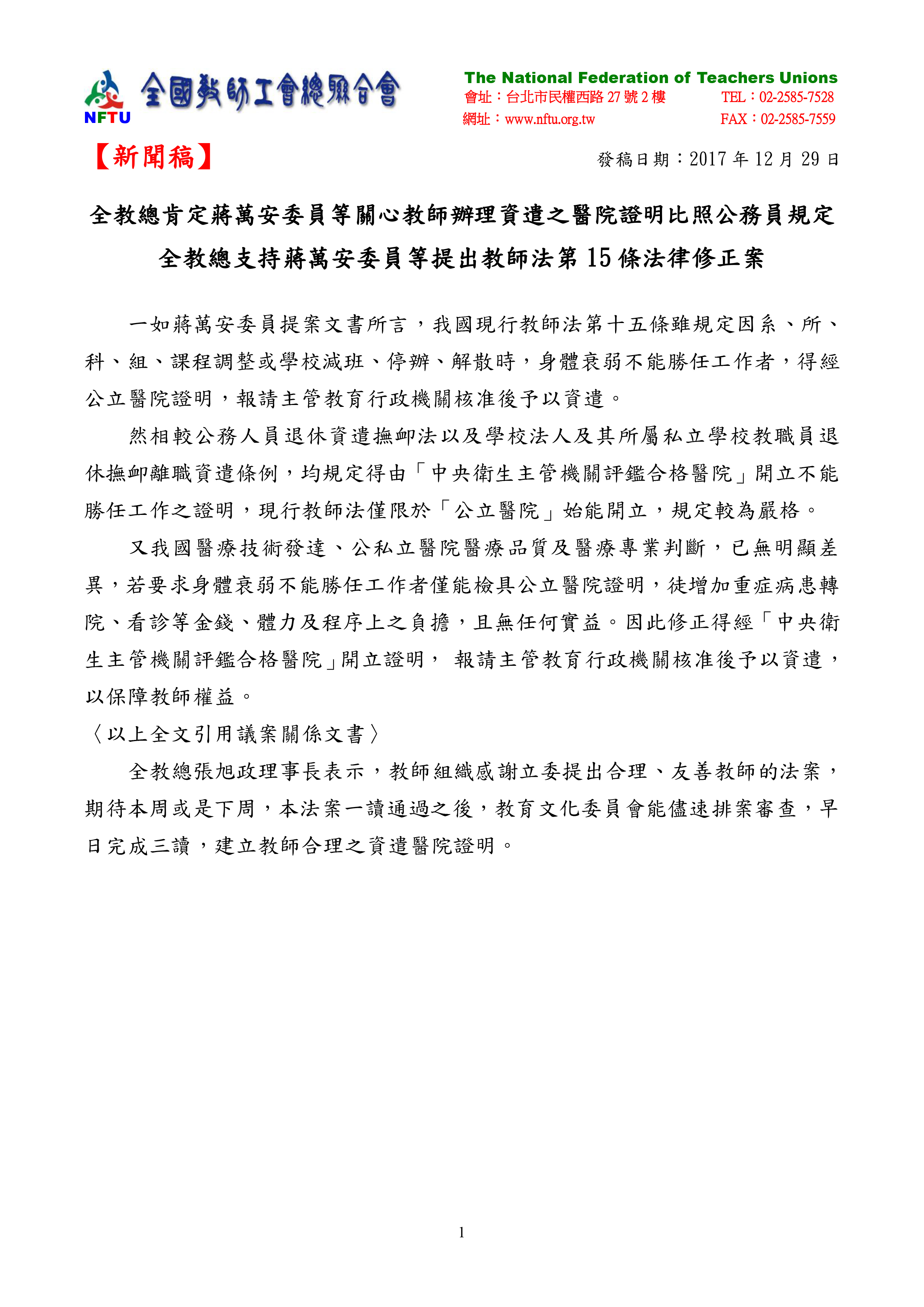 20171229【新聞稿】全教總肯定蔣萬安委員等關心教師辦理資遣之醫院證明比照公務員規定