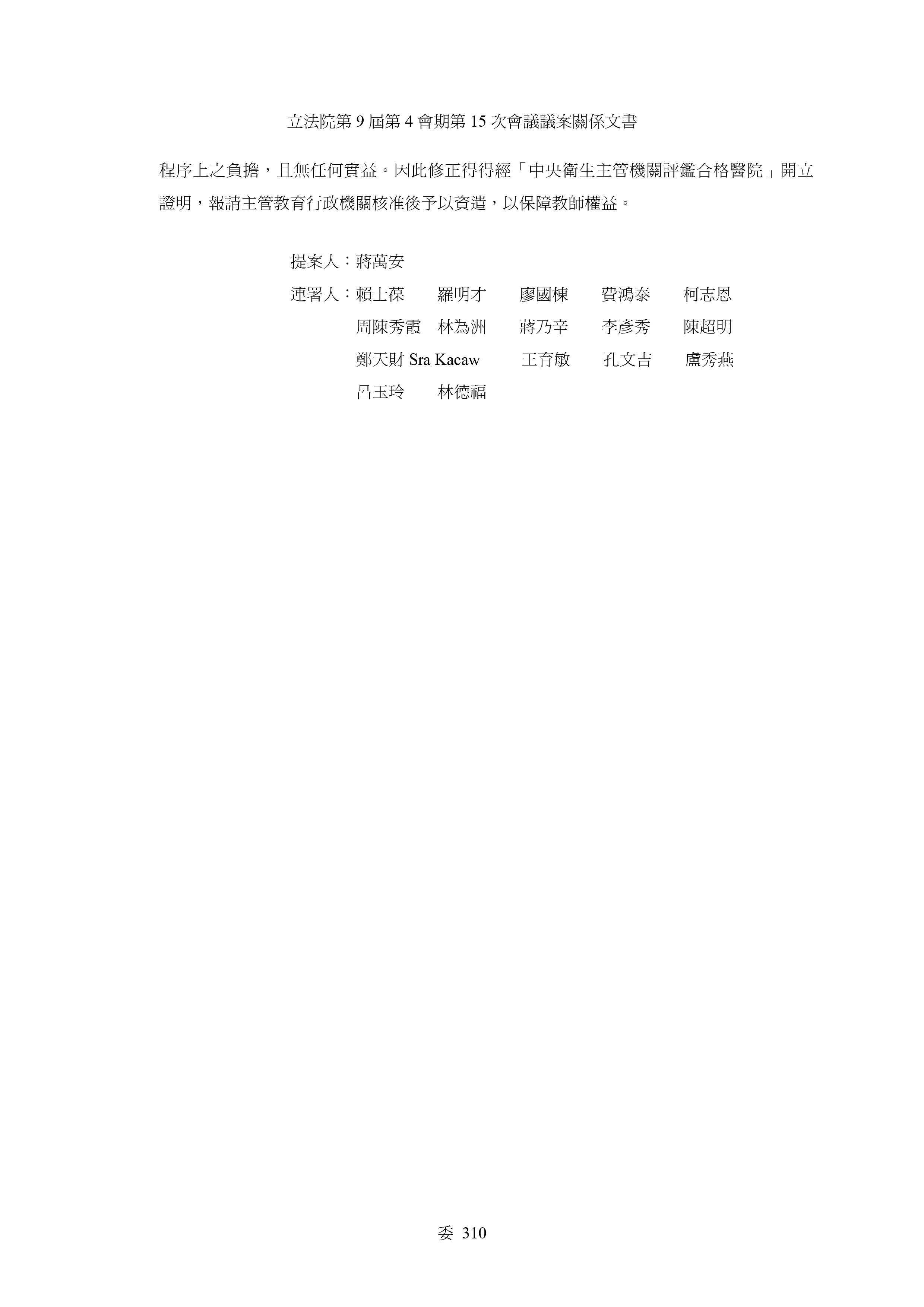 如蔣萬安立法委員於提案文書所言,我國現行教師法第十五條雖規定,「因系、所、科、組、課程調整或學校減班、停辦、解散時,身體衰弱不能勝任工作者,得經公立醫院證明,報請主管教育行政機關核准後予以資遣。」,然相較公務人員退休資遣撫卹法,以及學校法人及其所屬私立學校教職員退休撫卹離職資遣條例,均規定得由「中央衛生主管機關評鑑合格醫院」開立不能勝任工作之證明,現行教師法僅限於「公立醫院」始能開立,規定較為嚴格。又我國醫療技術發達,公私立醫院醫療品質及醫療專業判斷,已無明顯差異,若要求身體衰弱不能勝任工作者僅能檢具公立醫院證明,徒增重症病患轉院看診,金錢體力及程序上之負擔,且無任何實益。因此修正得經「中央衛生主管機關評鑑合格醫院」開立證明, 報請主管教育行政機關核准後予以資遣,以保障教師權益。〈以上全文引用議案關係文書〉全國教師工會總聯合會發布新聞稿,理事長張旭政表示,教師組織感謝立委提出合理友善教師的法案,期待今天(12月28)或是下周,本法案一讀通過之後,教育文化委員會能儘速排案審查,早日完成三讀,建立教師合理之資遣醫院證明。