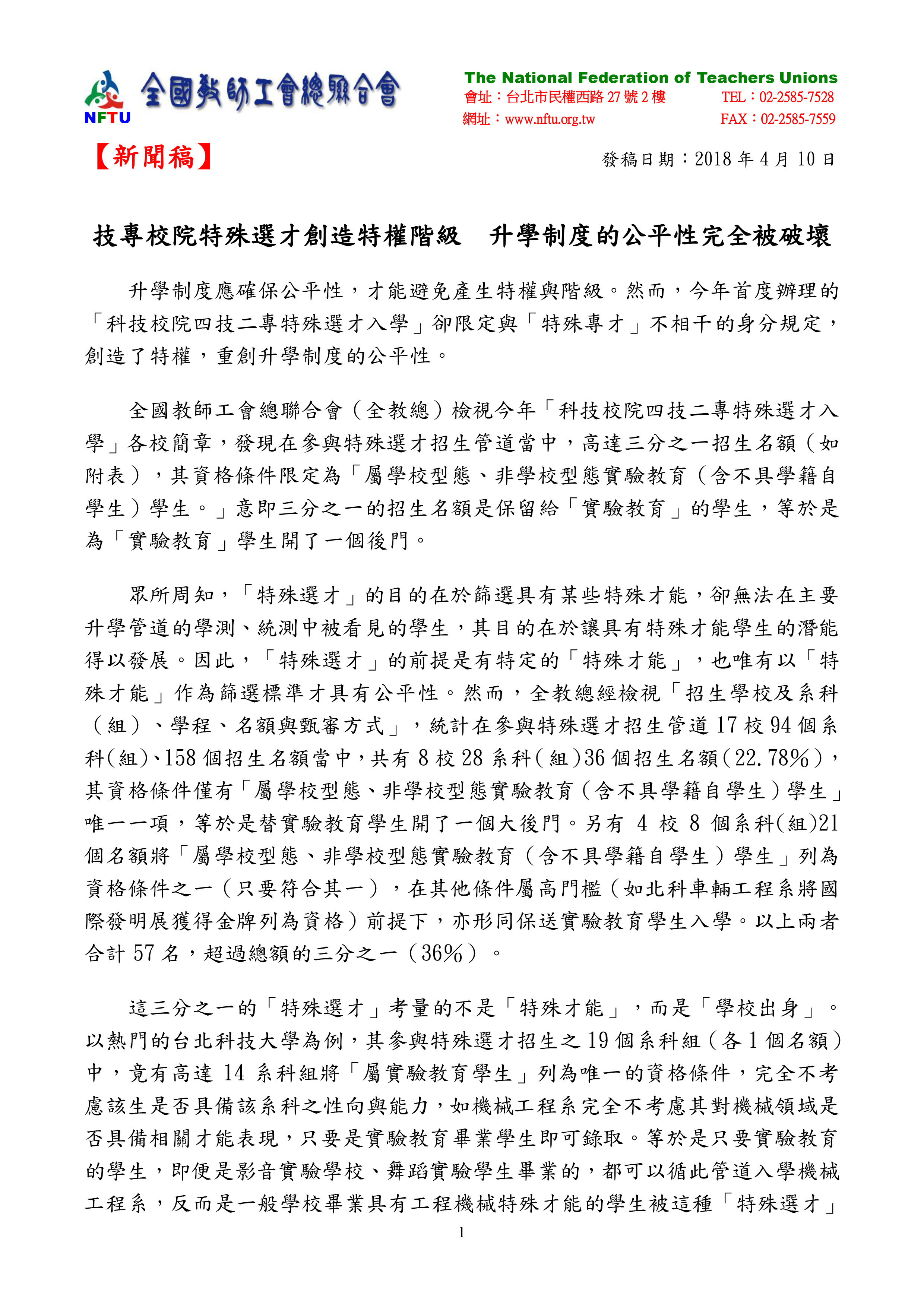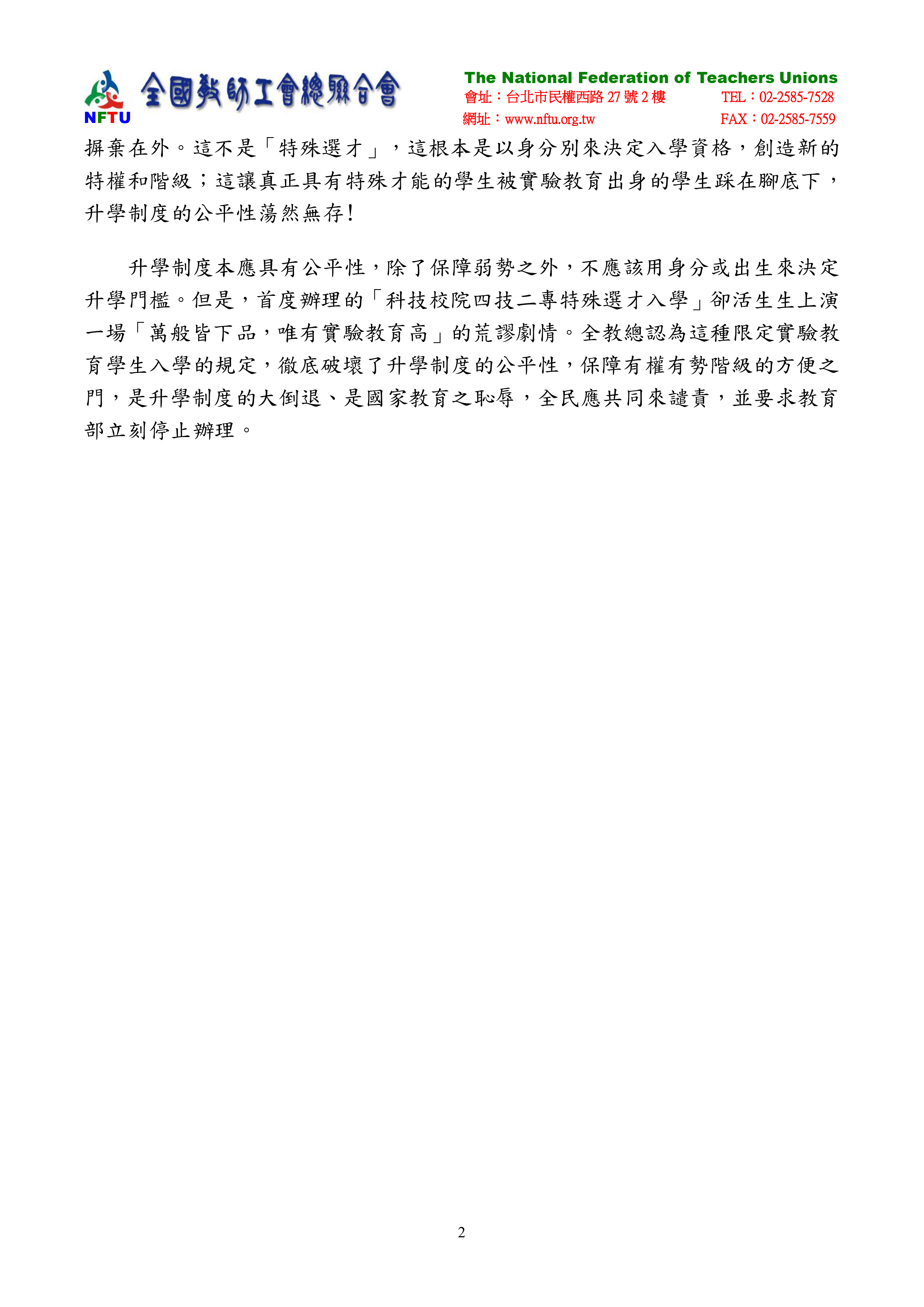 這讓真正具有特殊才能的學生被實驗教育出身的學生踩在腳底下,升學制度的公平性蕩然無存!全教總認為這種限定實驗教育學生入學的規定,徹底破壞了升學制度的公平性,保障有權有勢階級的方便之門,並要求教育部立刻停止辦理。