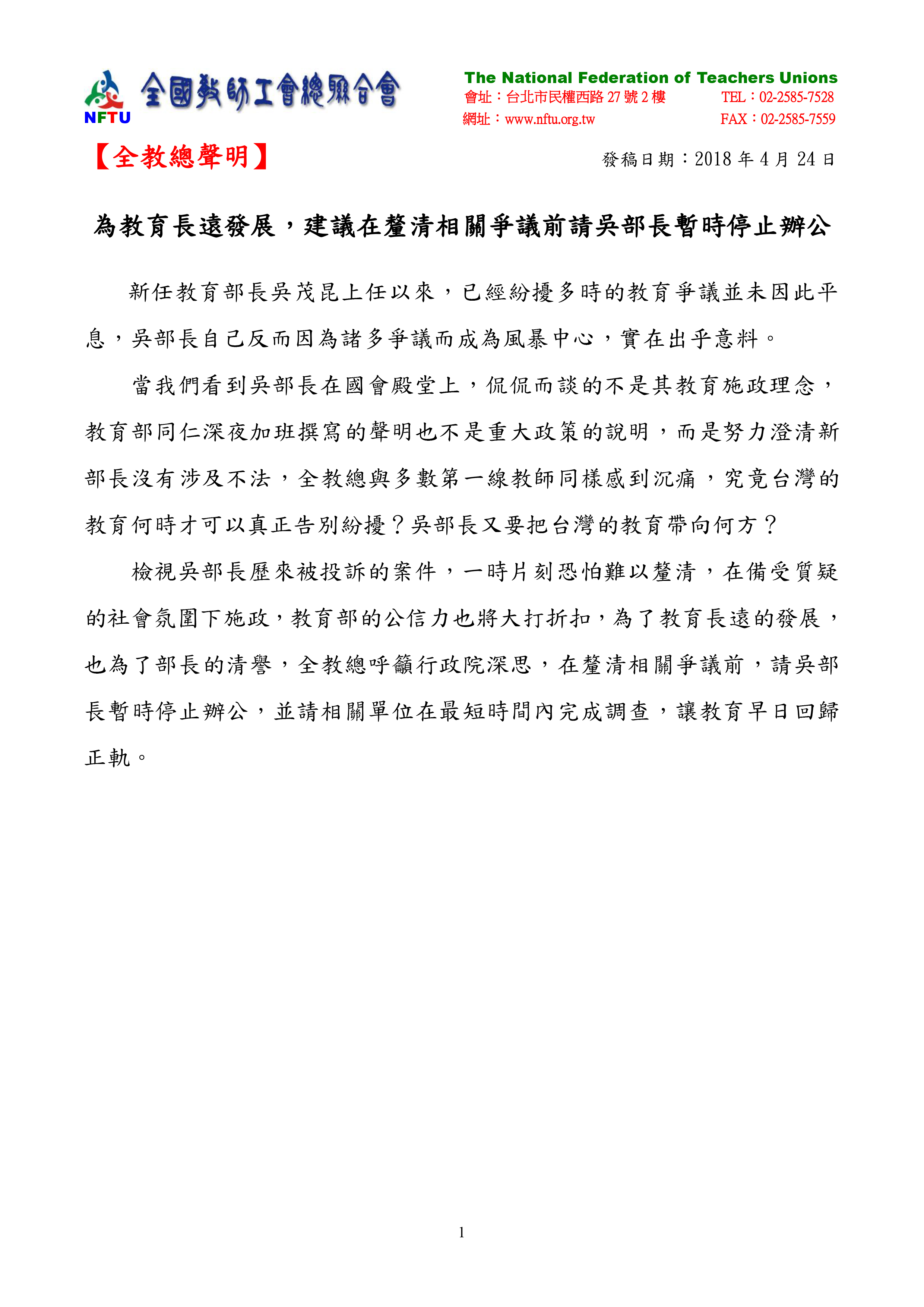 檢視吳部長歷來被投訴的案件,一時片刻恐怕難以釐清,在備受質疑的社會氛圍下施政,教育部的公信力也將大打折扣,為了教育長遠的發展,也為了部長的清譽,全教總呼籲行政院深思,在釐清相關爭議前,請吳部長暫時停止辦公,並請相關單位在最短時間內完成調查,讓教育早日回歸正軌。