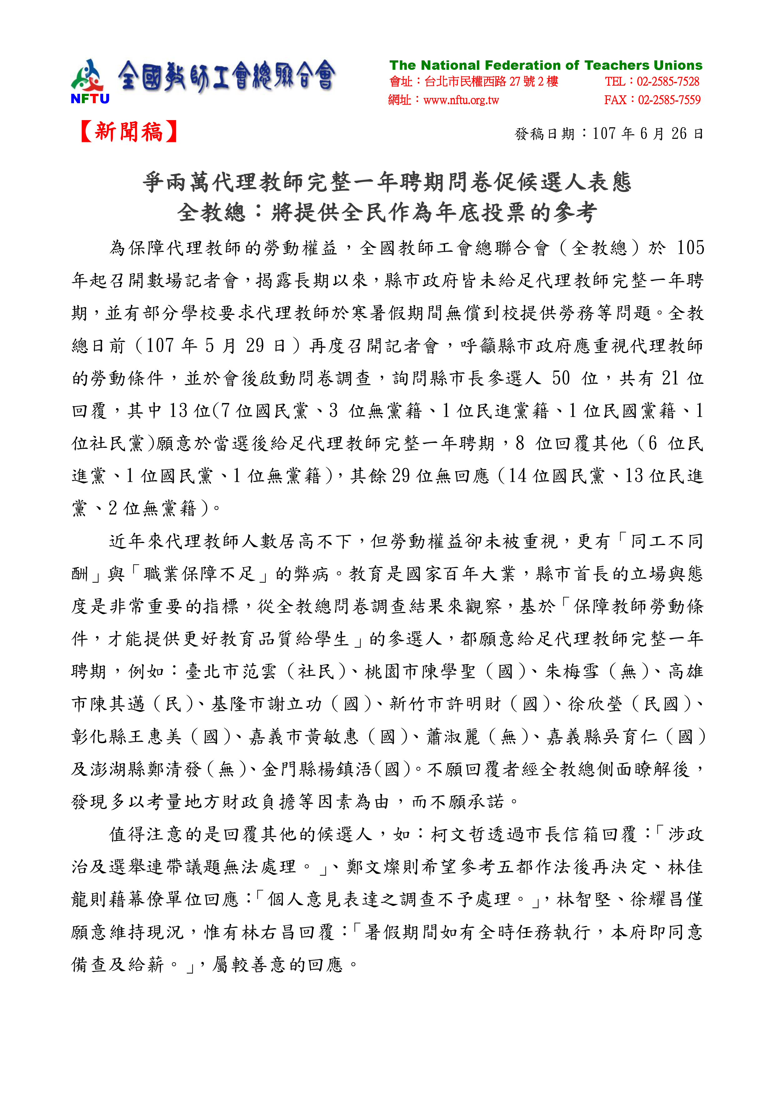 為保障代理教師的勞動權益,全國教師工會總聯合會(全教總)於2016年起召開數場記者會,揭露長期以來,縣市政府皆未給足代理教師完整一年聘期,並有部分學校要求代理教師於寒暑假期間,無償到校提供勞務等問題。全教總2018年5月29日再度召開記者會,呼籲縣市政府應重視代理教師的勞動條件,詢問縣市長參選人50 位,共有21位回覆。