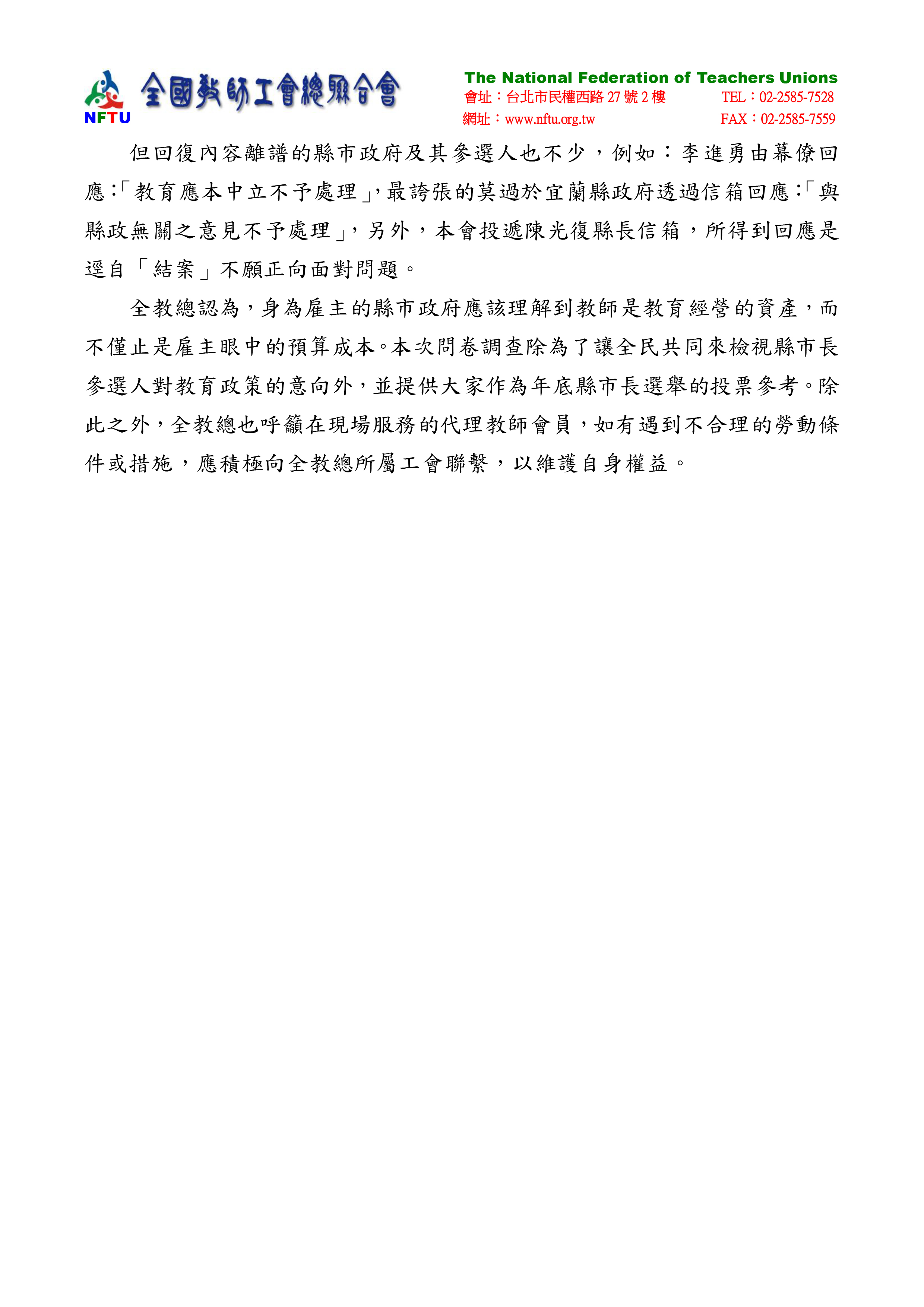 全教總認為,身為雇主的縣市政府應該理解到教師是教育經營的資產,而不僅止是雇主眼中的預算成本。本次問卷調查除為了讓全民共同來檢視縣市長參選人對教育政策的意向外,並提供大家作為年底縣市長選舉的投票參考。