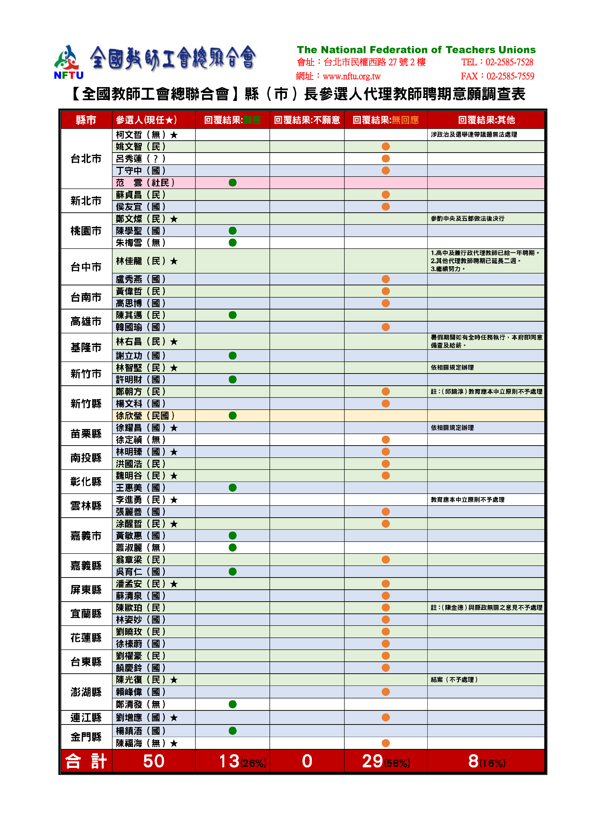 從全教總問卷調查結果來觀察,基於「保障教師勞動條件,才能提供更好教育品質給學生」的參選人,都願意給足代理教師完整一年聘期,不願回覆者經全教總側面瞭解後,發現多以考量地方財政負擔等因素為由,而不願承諾。