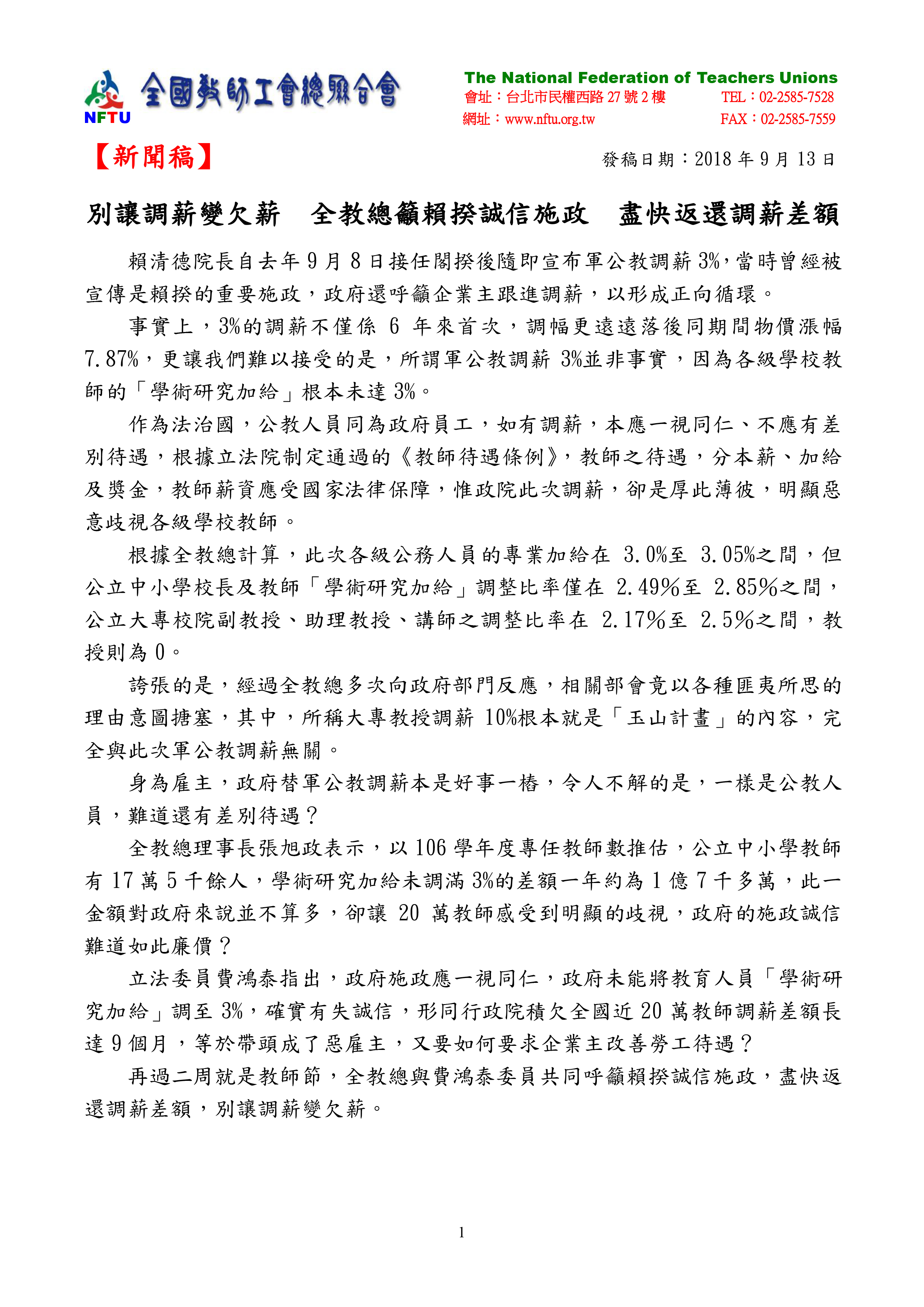 賴清德院長自2018年9月8日接任閣揆後隨即宣布軍公教調薪3%,政府還呼籲企業主跟進調薪,以形成正向循環。全國教師工會總聯合會(全教總)難以接受所謂軍公教調薪3%並非事實,因為各級學校教師的「學術研究加給」根本未達3%。