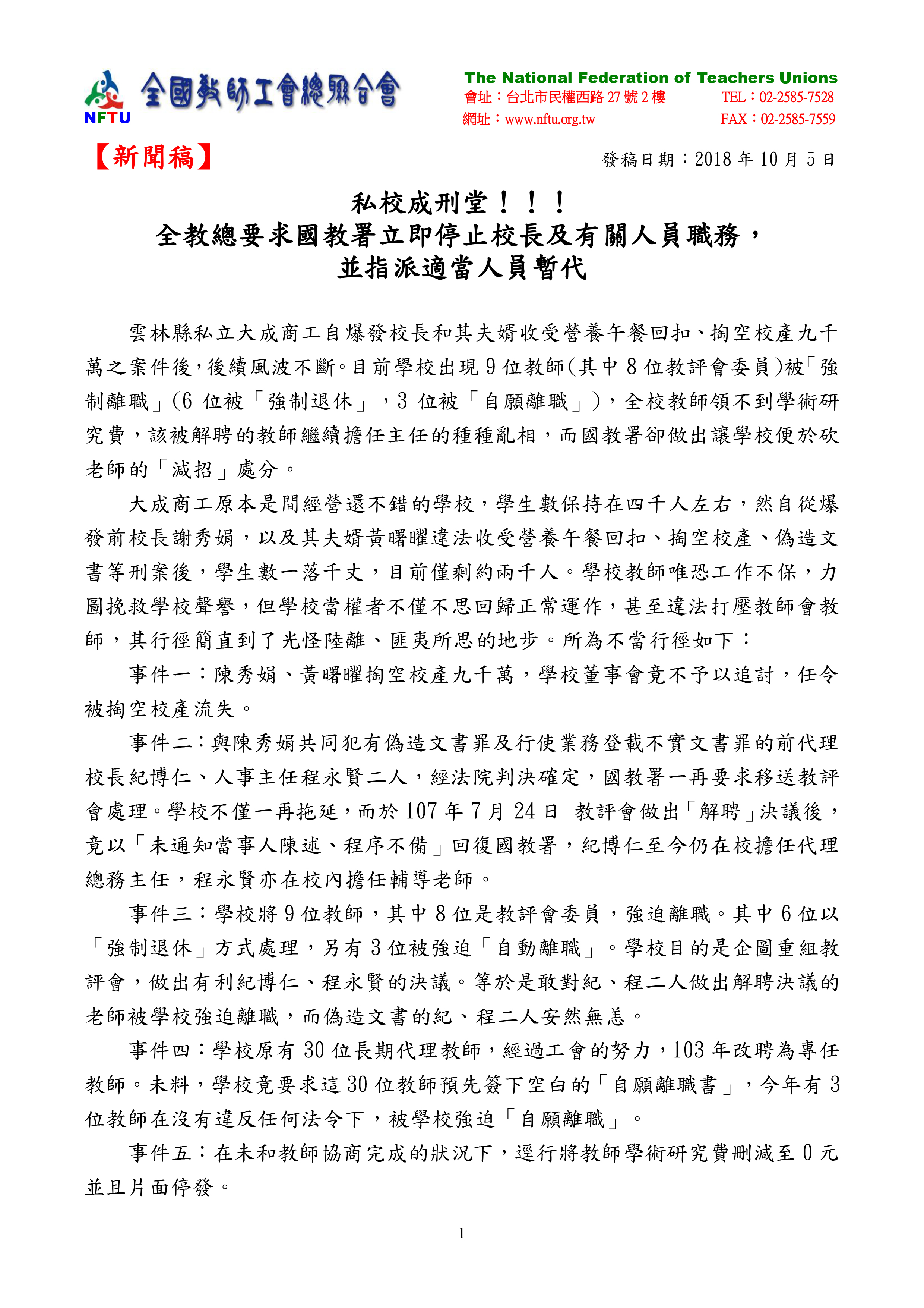 雲林縣私立大成商工出現9位教師被「強制離職」,教師領不到學術研究費,該被解聘的教師繼續擔任主任的種種亂相,而國教署卻做出讓學校便於砍老師的「減招」處分,所為不當行徑如下: