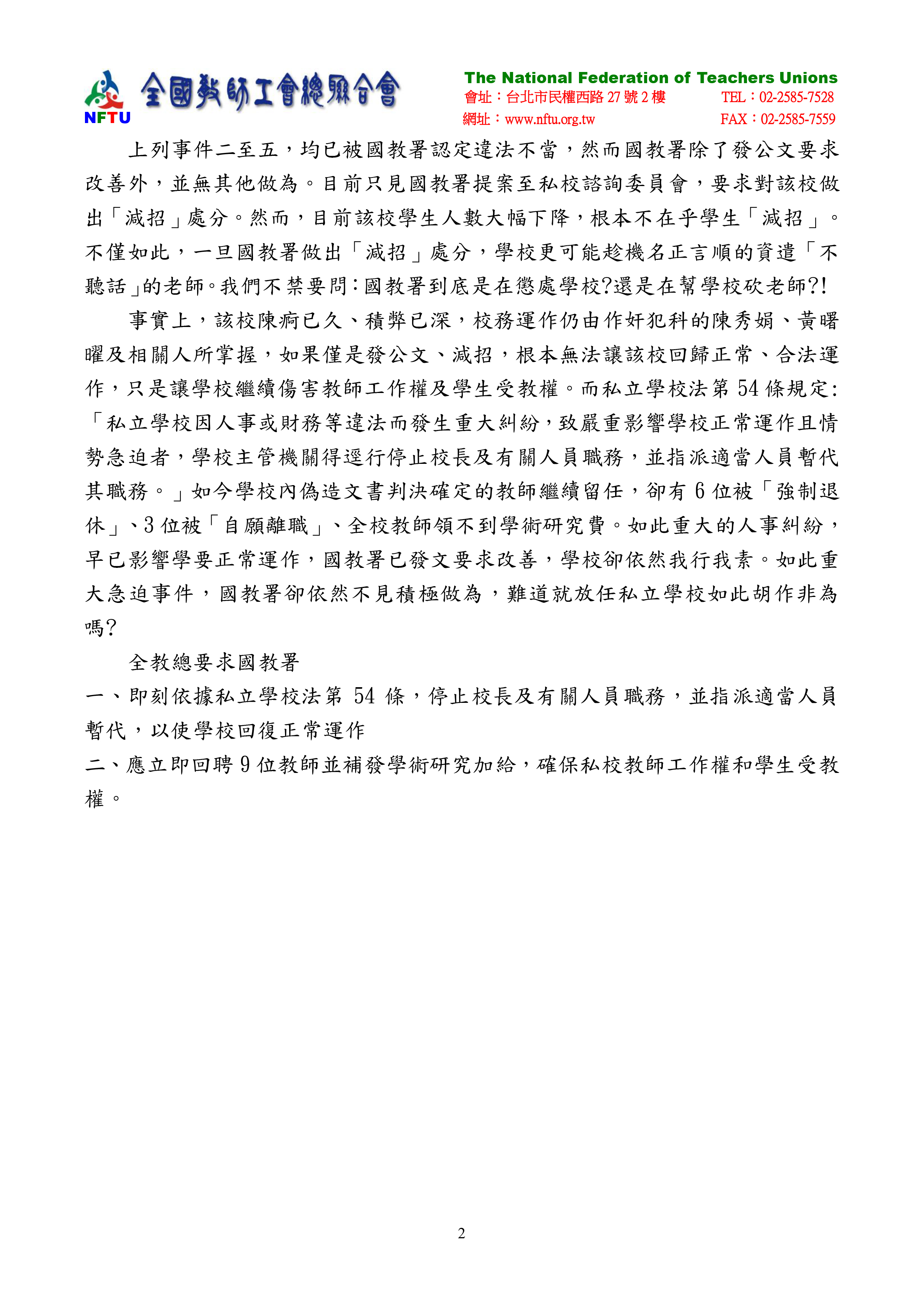 二、應立即回聘9位教師並補發學術研究加給,確保私校教師工作權和學生受教權。
