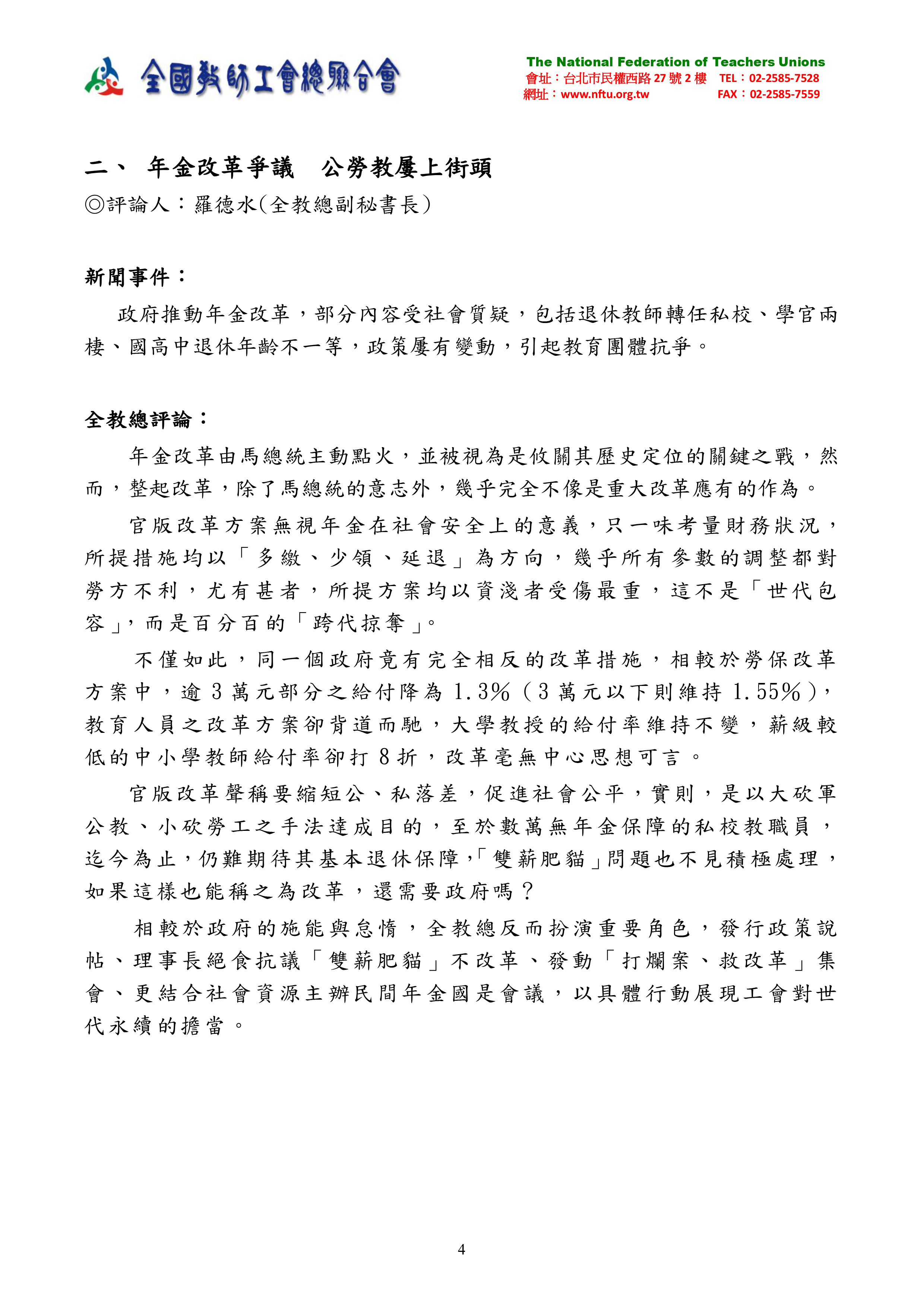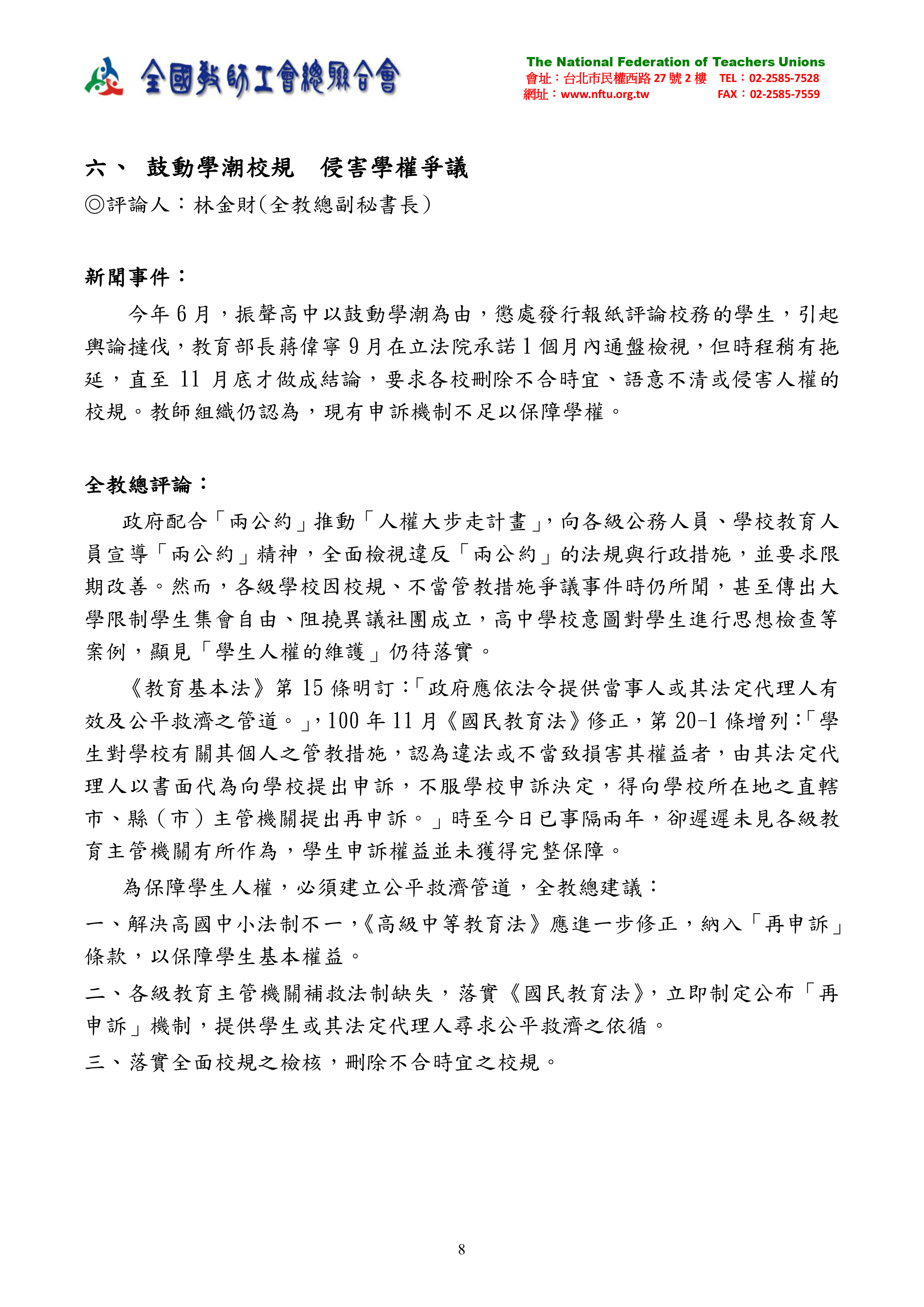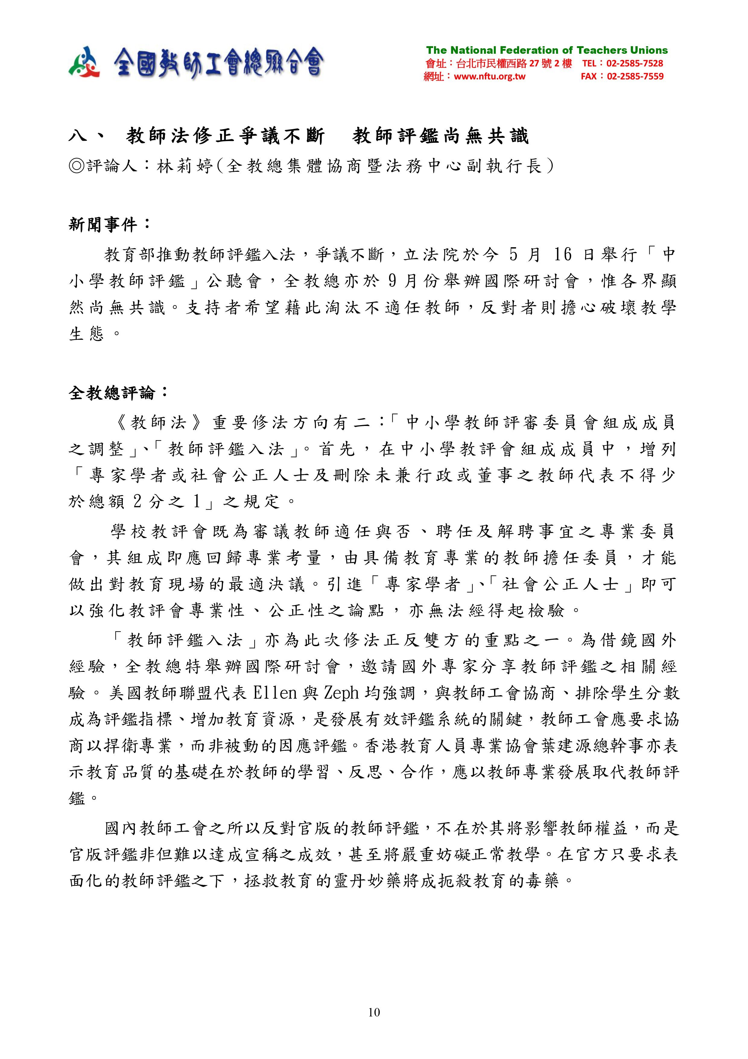 八、教師法修正爭議不斷,教師評鑑尚無共識。