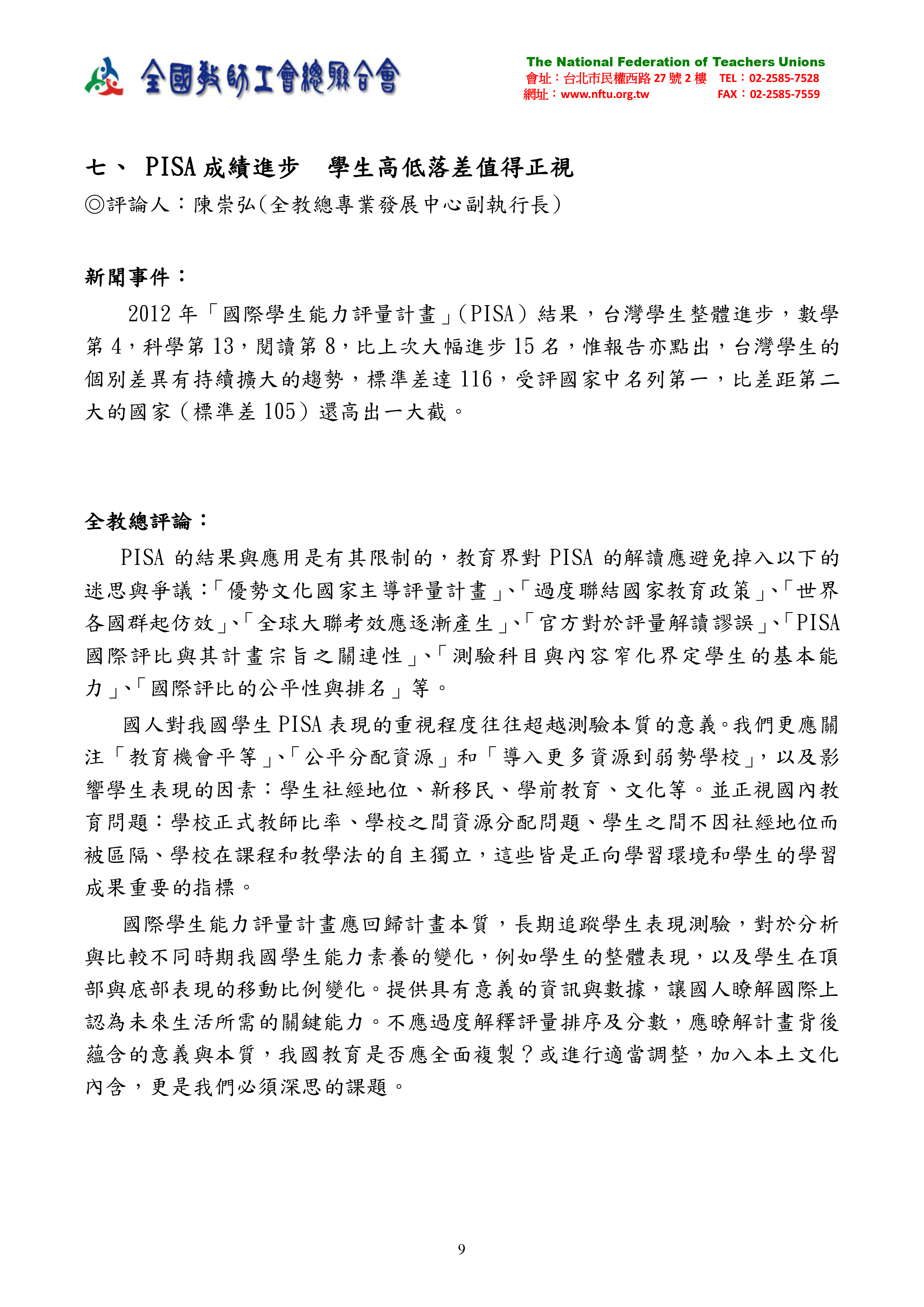 基本上,2013十大教育新聞可以分成三類,屬於「重大政策」者有:12年國教、年金改革爭議、大專學費調整、人才培育政策、教師法修正爭議;攸關「教育品質」的有:PISA成績、少子化危機衝擊招生、與「教育人權」有關的則有:私校屢傳減薪、校規侵害學權、教師工會一波三折等。值得注意的,一如媒體票選出的2013年度代表字-「假」,2013年十大教育新聞中,無論是「變調走樣的12年國教」、「錯誤百出的年金改革」、「淪為口號宣示的學權保障」、「違反專業的教師法修法」、「缺乏宏觀視野的人才培育」,也充分展現這些教育新聞事件背後的假、錯、亂,值得各界正視。