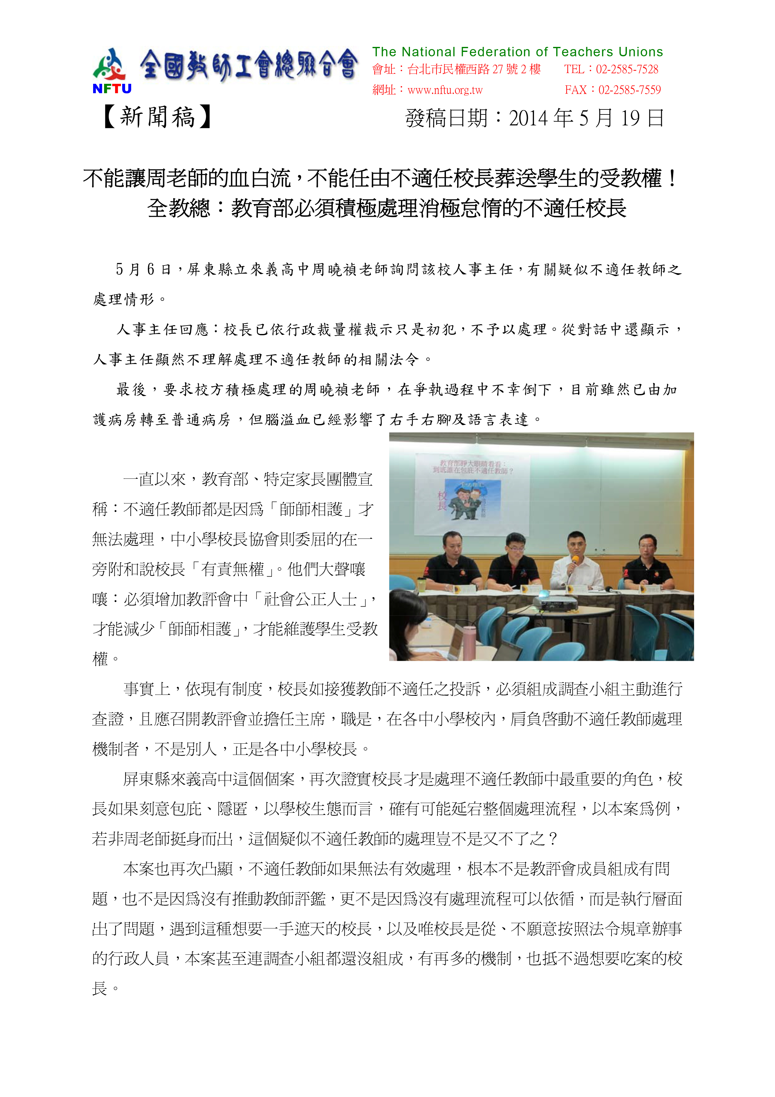5月6日,屏東縣立來義高中周曉禎老師詢問該校人事主任,有關疑似不適任教師之處理情形。人事主任回應:「校長已依行政裁量權裁示只是初犯,不予以處理。」最後,要求校方積極處理的周曉禎老師,在爭執過程中不幸倒下,雖然目前已由加護病房轉至普通病房,但腦溢血已經影響了右手右腳及語言表達。