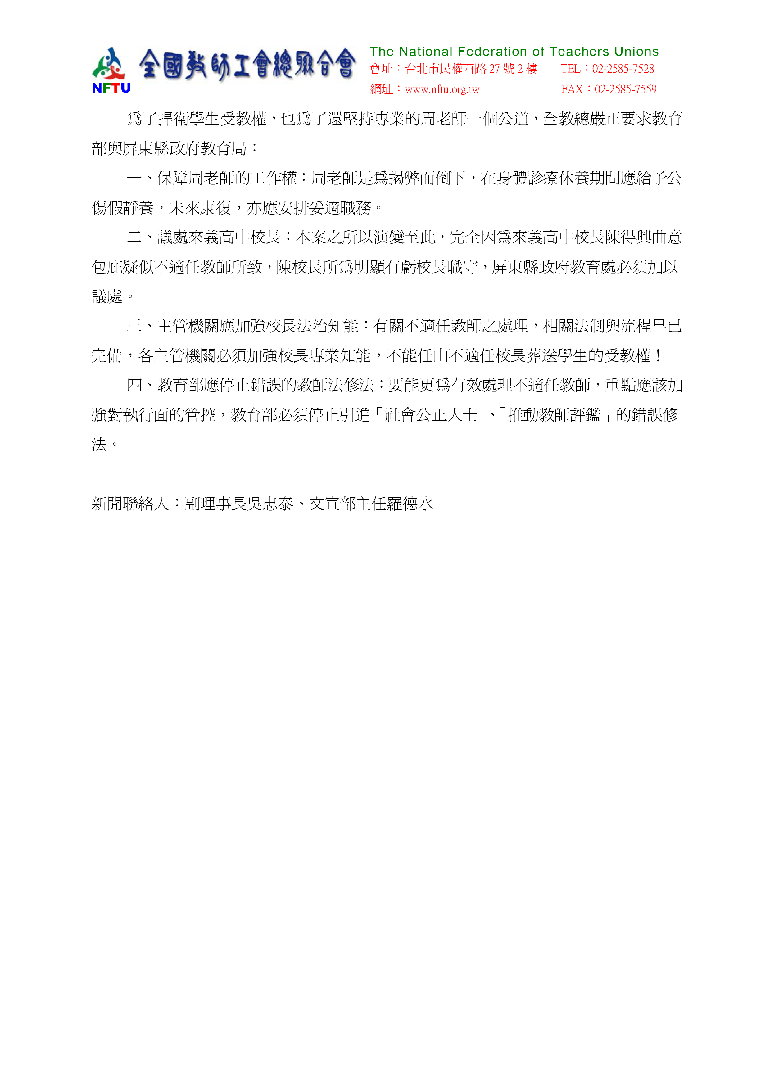為了捍衛學生受教權,也為了還堅持專業的周老師一個公道,全教總嚴正要求教育部與屏東縣政府教育局: