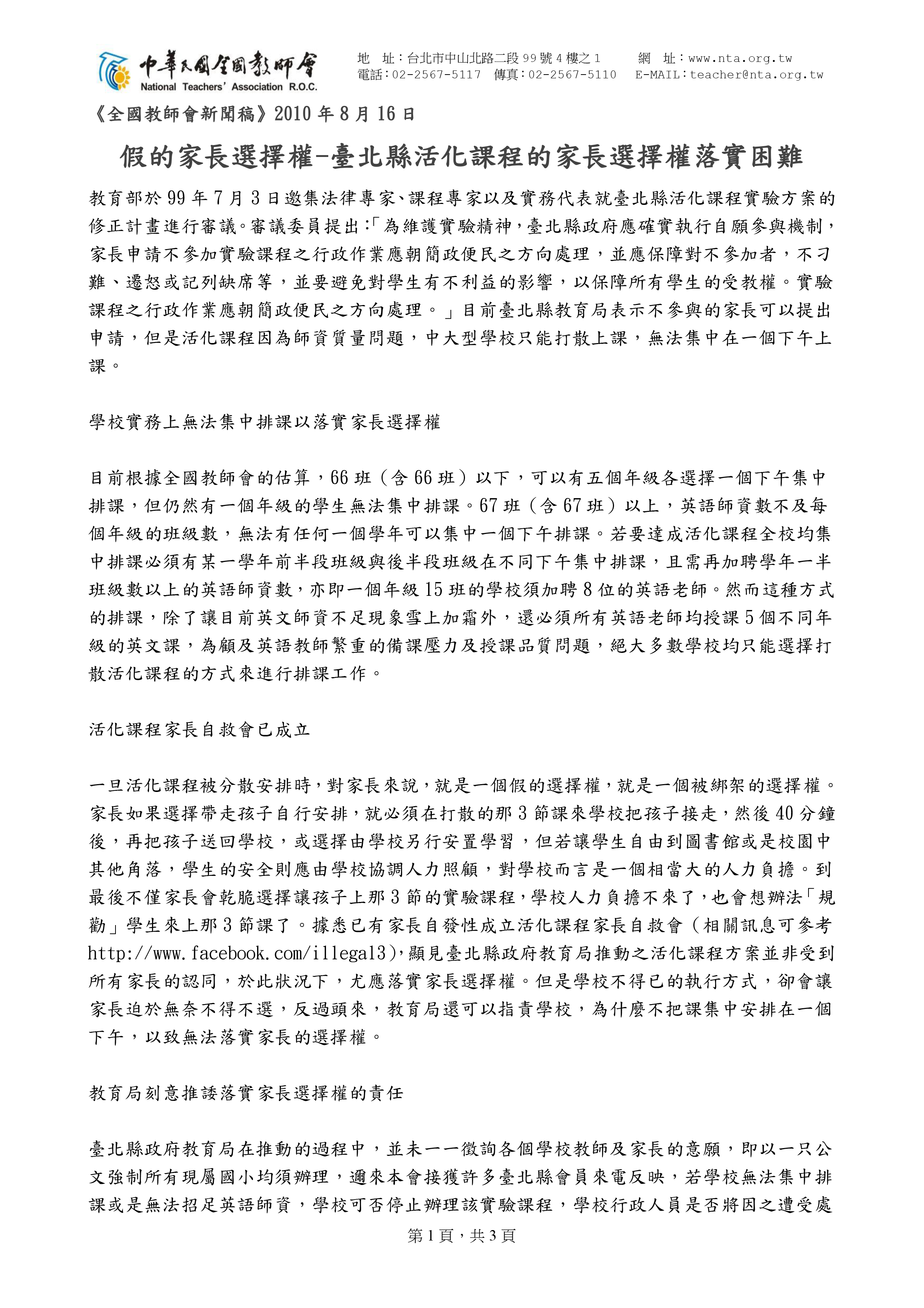 對於臺北縣教育局表示不參與英語活化課程實驗方案的家長可以提出申請,中華民國全國教師會(全教會)於2010年8月16日發佈新聞稿-假的家長選擇權,臺北縣活化課程的家長選擇權落實困難,提出質疑。