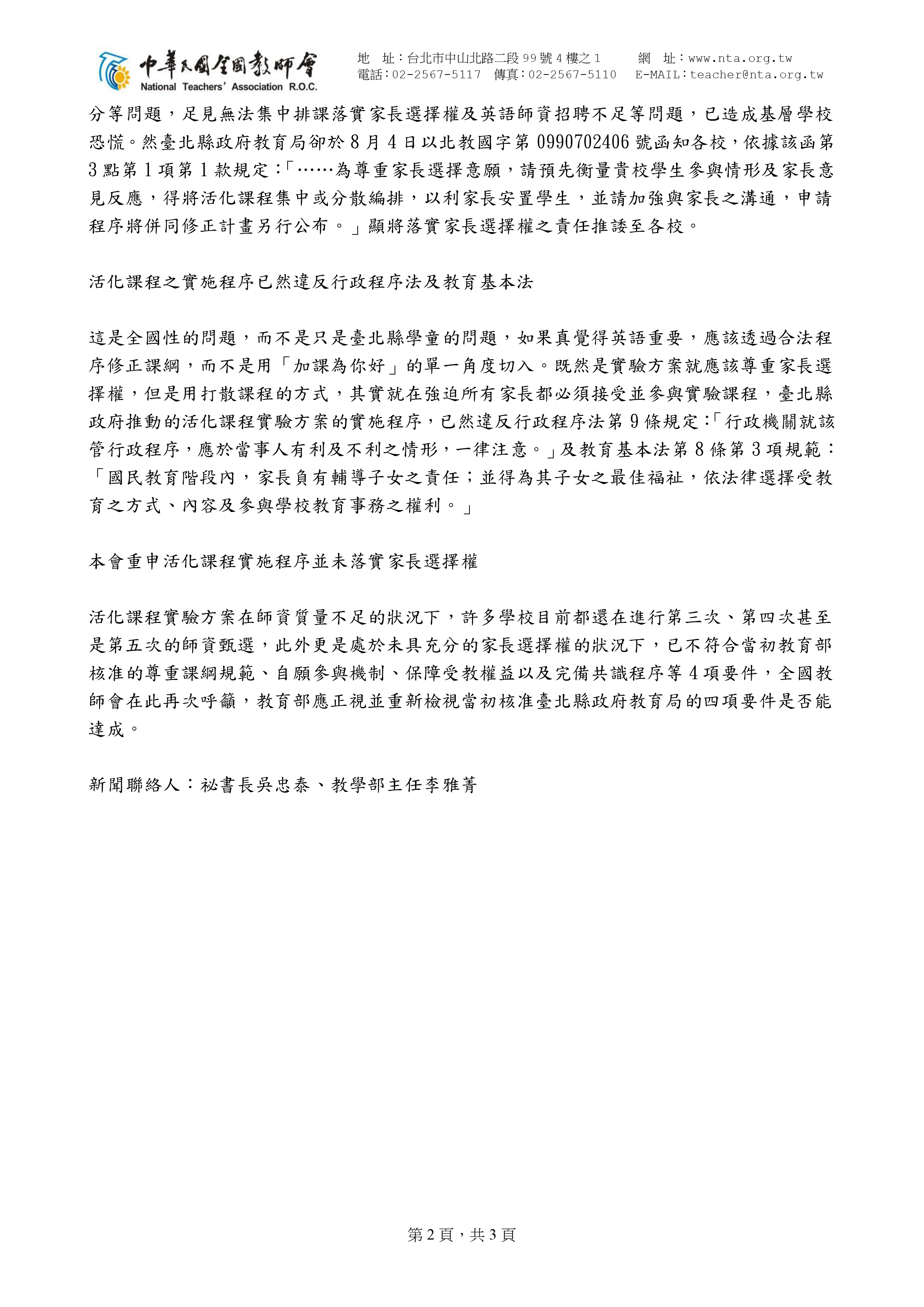 五、活化課程實施程序並未落實家長選擇權:活化課程實驗方案在師資質量不足的狀況下,許多學校目前都還在進行第三次、第四次甚至是第五次的師資甄選,此外更是處於未具充分的家長選擇權的狀況下,已不符合當初教育部核准的尊重課綱規範、自願參與機制、保障受教權益,以及完備共識程序等4項要件。