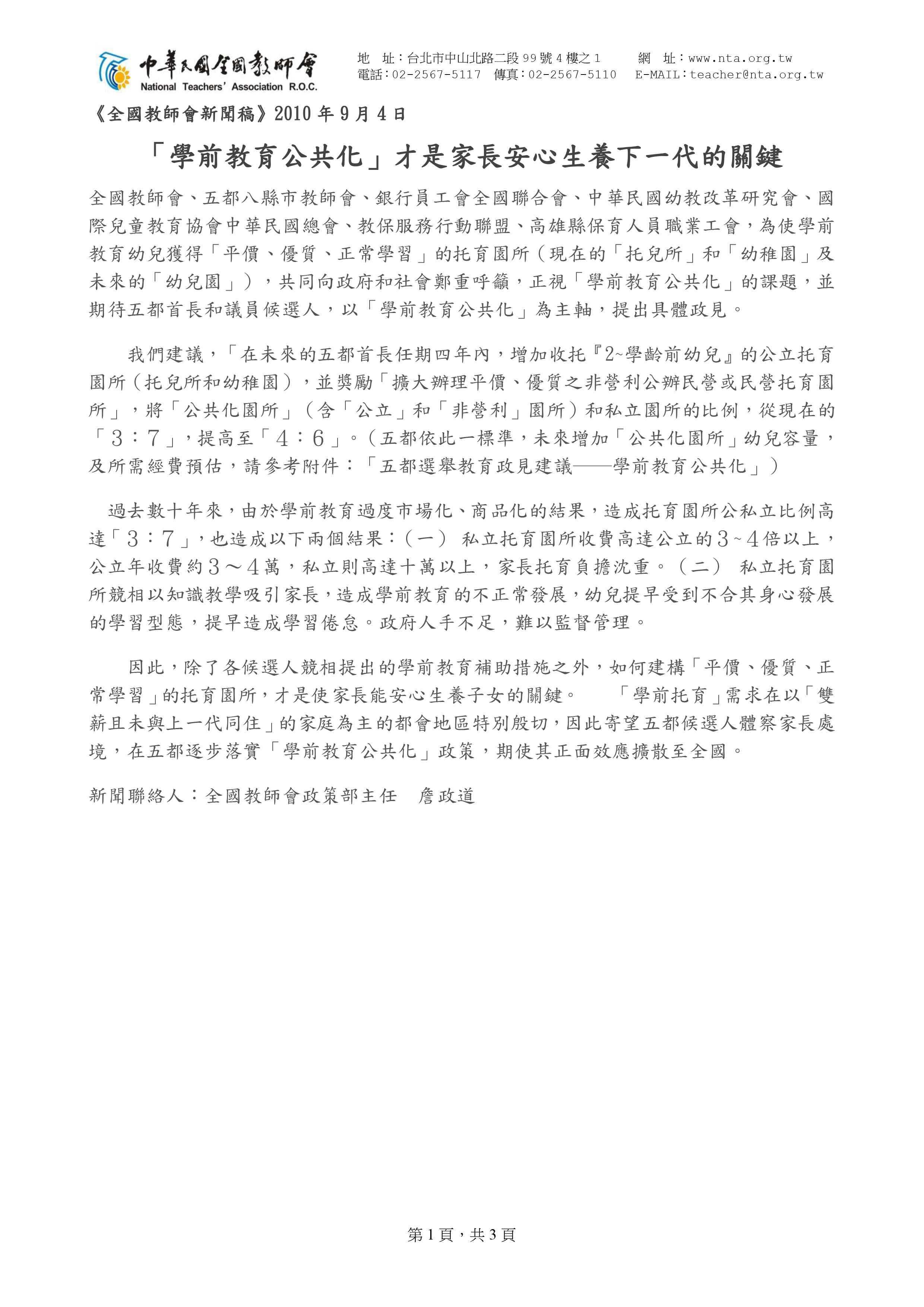 為使學前教育幼兒獲得「平價、優質、正常學習」的托育園所,中華民國全國教師會(全教會)聯合五都八縣市教師會、銀行員工會全國聯合會、中華民國幼教改革研究會、國際兒童教育協會中華民國總會、教保服務行動聯盟、高雄縣保育人員職業工會於2010年9月4日發佈新聞稿-「學前教育公共化」才是家長安心生養下一代的關鍵,共同向政府和社會鄭重呼籲,正視「學前教育公共化」的課題,並期待五都首長和議員候選人,以「學前教育公共化」為主軸,提出具體政見。