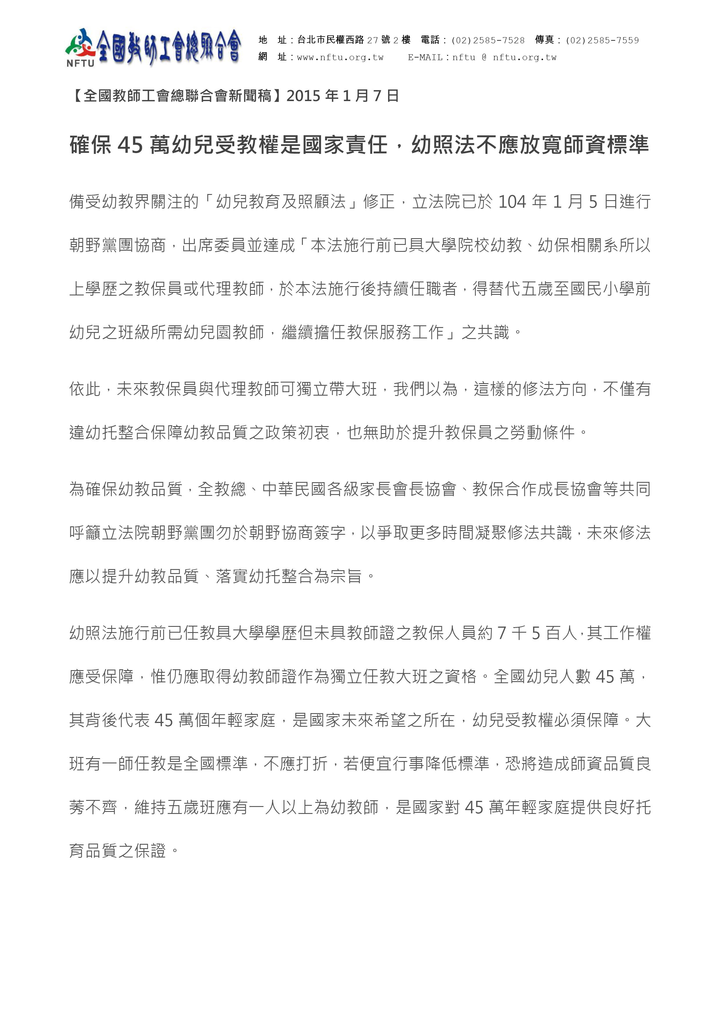 備受幼教界關注的「幼兒教育及照顧法」修正,立法院已於2015年1月5日進行朝野黨團協商,出席委員並達成「本法施行前已具大學院校幼教、幼保相關系所以上學歷之教保員或代理教師,於本法施行後持續任職者,得替代五歲至國民小學前幼兒之班級所需幼兒園教師,繼續擔任教保服務工作」之共識。中華民國全國教師會(全教會)與全國教師工會總聯合會於2015年1月7日發佈新聞稿-確保45萬幼兒受教權是國家責任,幼照法不應放寬師資標準,針對未來教保員與代理教師可獨立帶大班,全教會以為,這樣的修法方向,不僅有違幼托整合保障幼教品質之政策初衷,也無助於提升教保員之勞動條件。