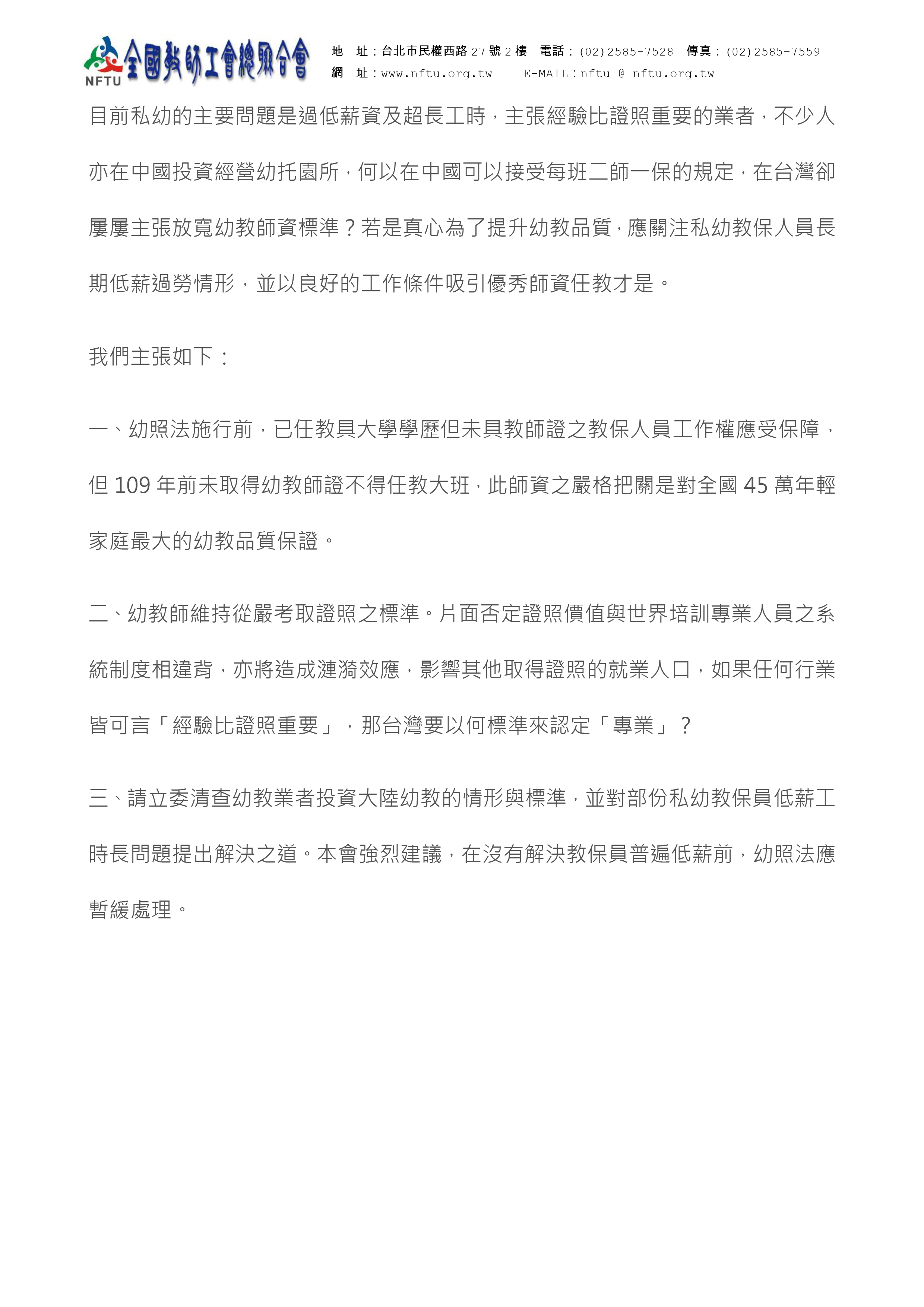 全教會聯合全教總、中華民國各級家長會長協會、教保合作成長協會等共同呼籲立法院朝野黨團勿於朝野協商簽字,以爭取更多時間凝聚修法共識,未來修法應以提升幼教品質、落實幼托整合為宗旨。