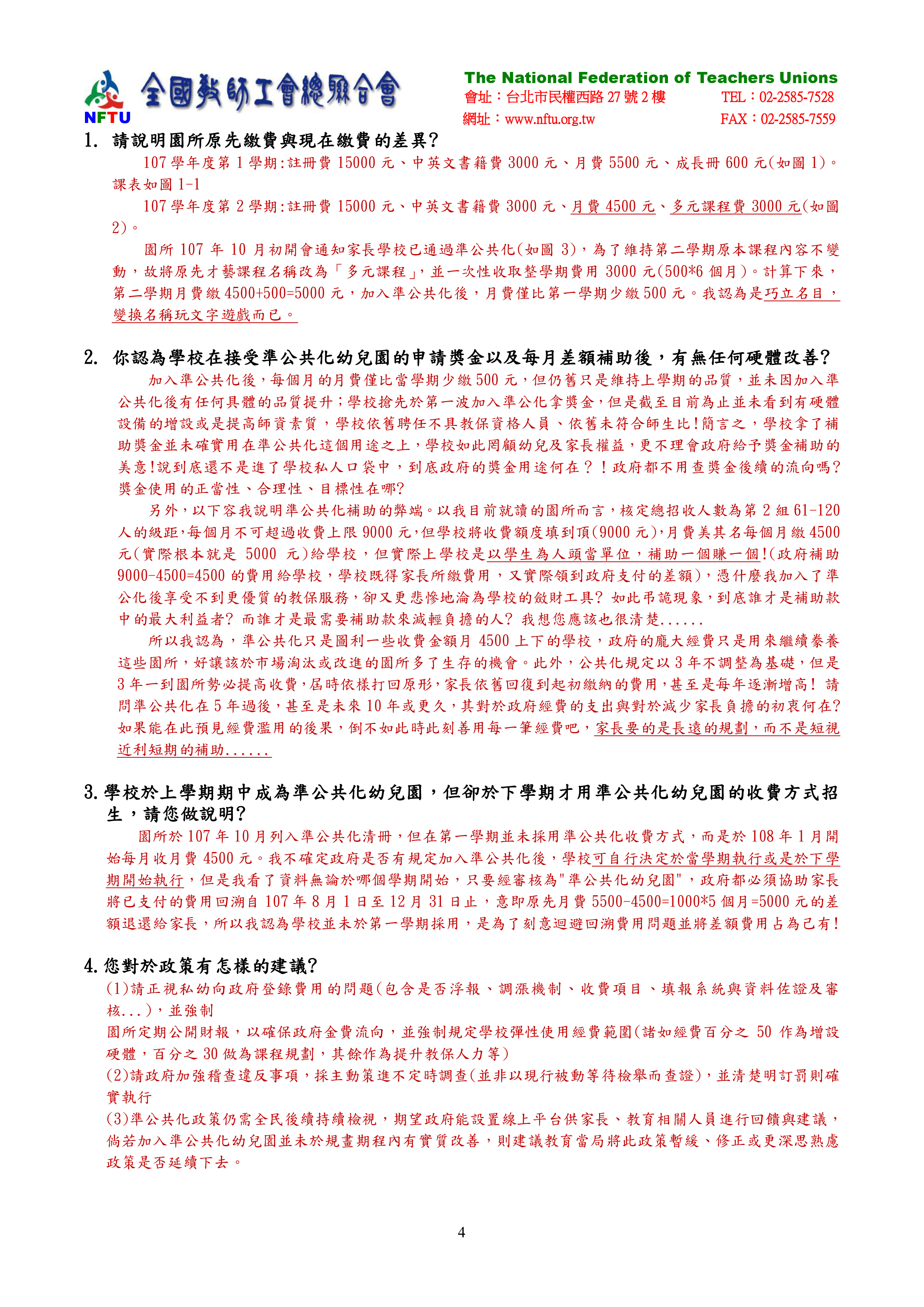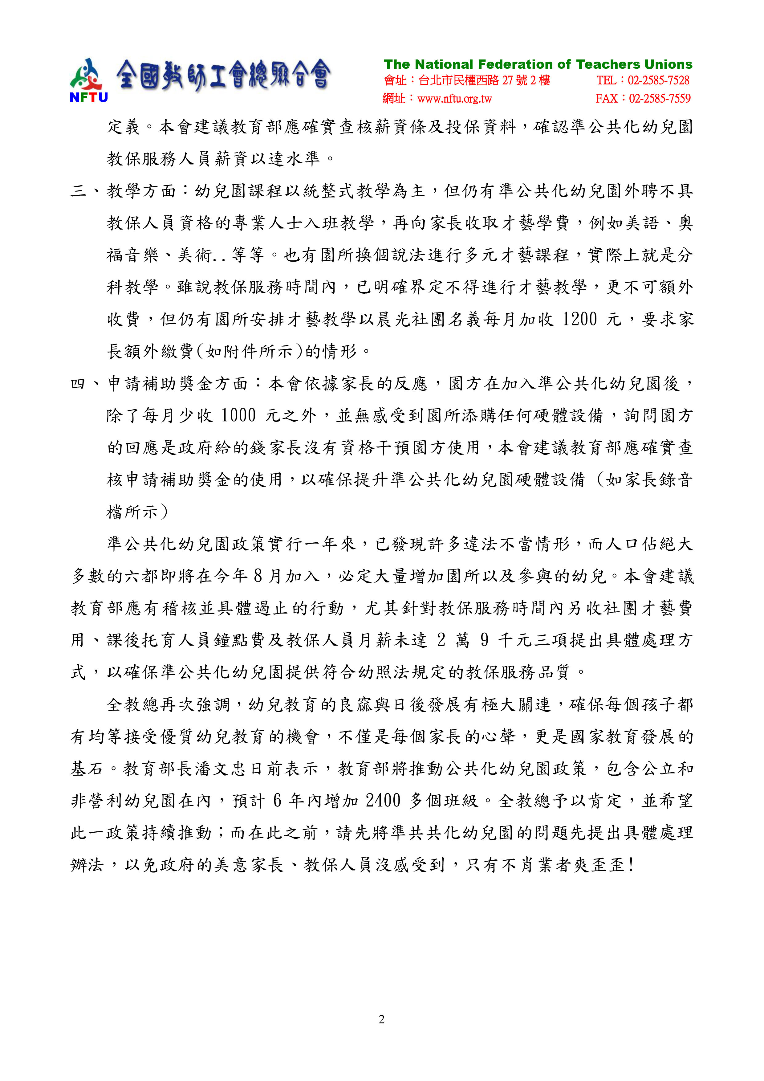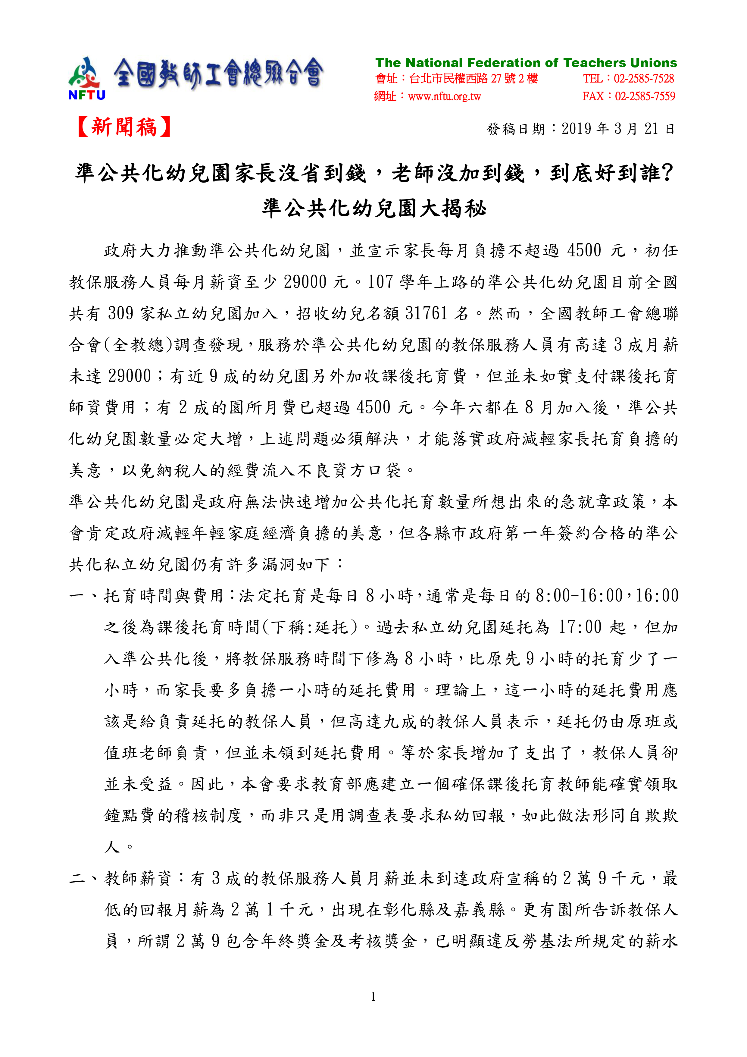 政府大力推動準公共化幼兒園,並宣示家長每月負擔不超過4500元,初任教保服務人員每月薪資至少29000元。中華民國全國教師會(全教會)與全國教師工會總聯合會於2019年3月21日發佈新聞稿-準公共化幼兒園家長沒省到錢,老師沒加到錢,到底好到誰,準公共化幼兒園大揭秘,指出服務於準公共化幼兒園的教保服務人員有高達3成月薪未達29000元;有近9成的幼兒園另外加收課後托育費,但並未如實支付課後托育師資費用;有2成的園所月費已超過4500元。今年六都在8月加入後,準公共化幼兒園數量必定大增,上述問題必須解決,才能落實政府減輕家長托育負擔的美意,以免納稅人的經費流入不良資方口袋。