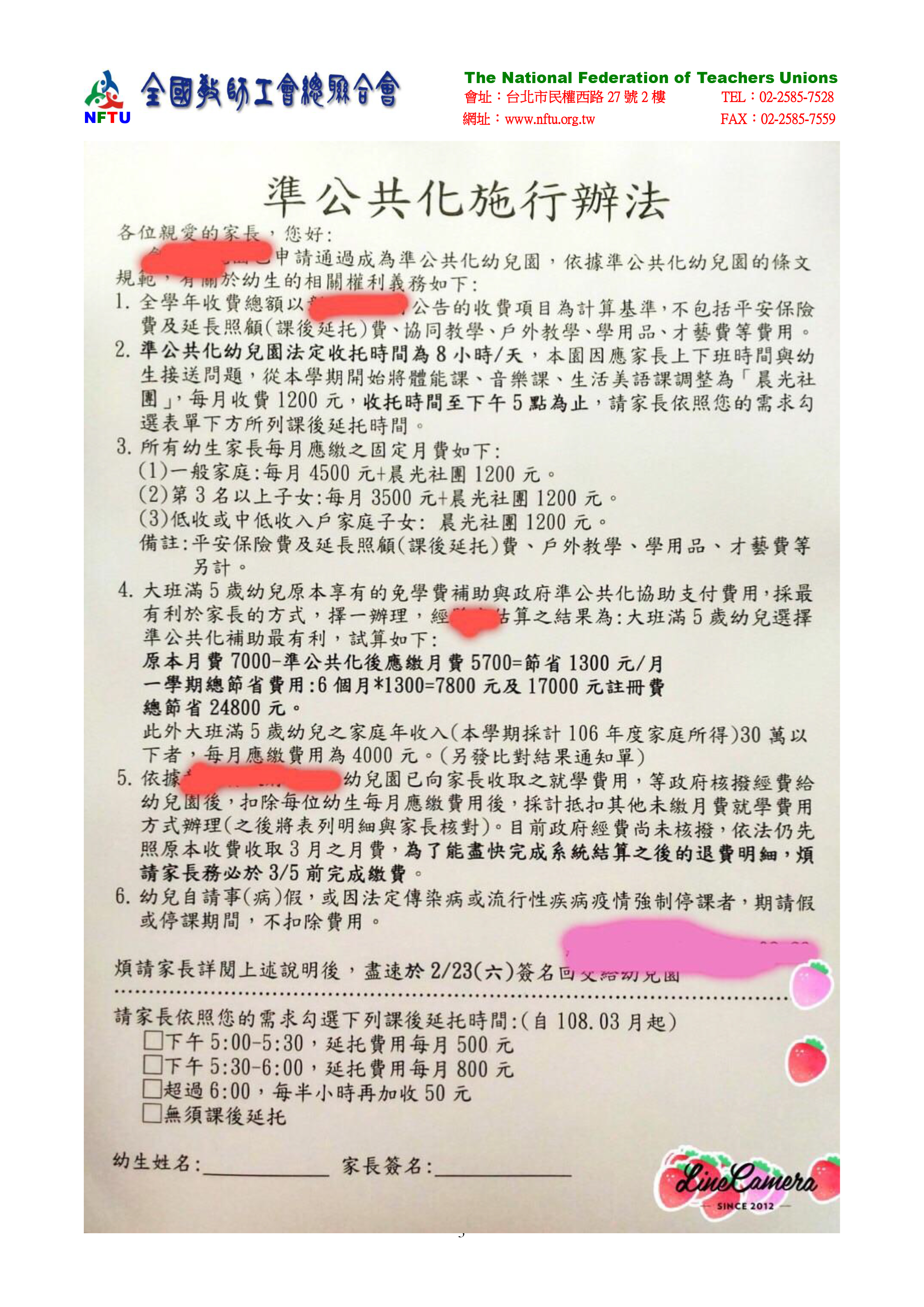 全教會再次強調,幼兒教育的良窳與日後發展有極大關連,確保每個孩子都有均等接受優質幼兒教育的機會,不僅是每個家長的心聲,更是國家教育發展的基石。教育部長潘文忠日前表示,教育部將推動公共化幼兒園政策,包含公立和非營利幼兒園在內,預計6年內增加2400個班級。上述政策全教總予以強烈肯定,並希望此一政策持續推動;但在此之前,請先針對準公共化幼兒園的問題提出具體處理辦法,以免政府的美意家長、教保人員沒感受到,卻圖利了不肖業者!