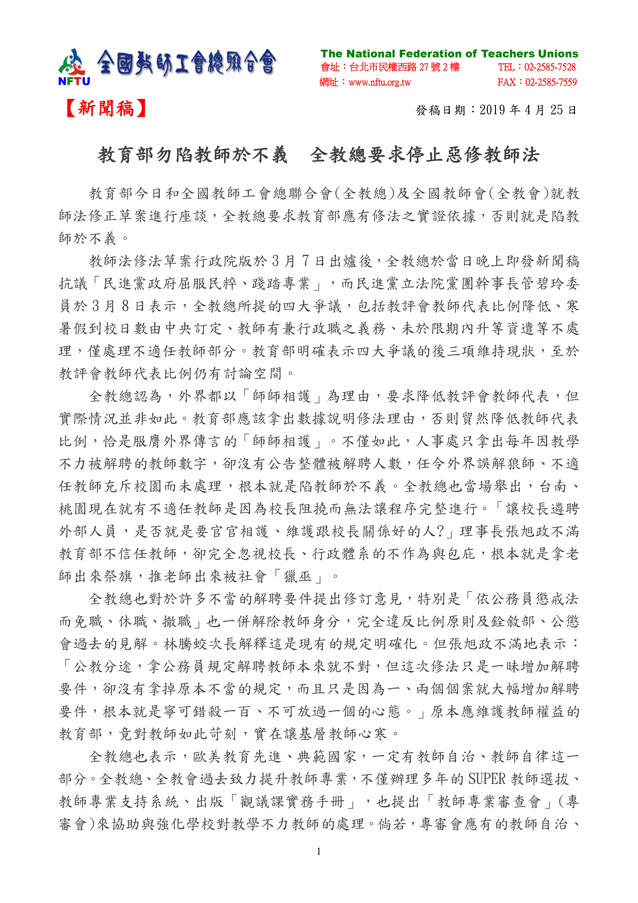 2019年4月25日教育部和全國教師工會總聯合會(全教總)及中華民國全國教師會(全教會)就教師法修正草案進行座談,全教會發佈新聞稿-教育部勿陷教師於不義,全教總要求停止惡修教師法,要求教育部應有修法之實證依據,否則就是陷教師於不義。