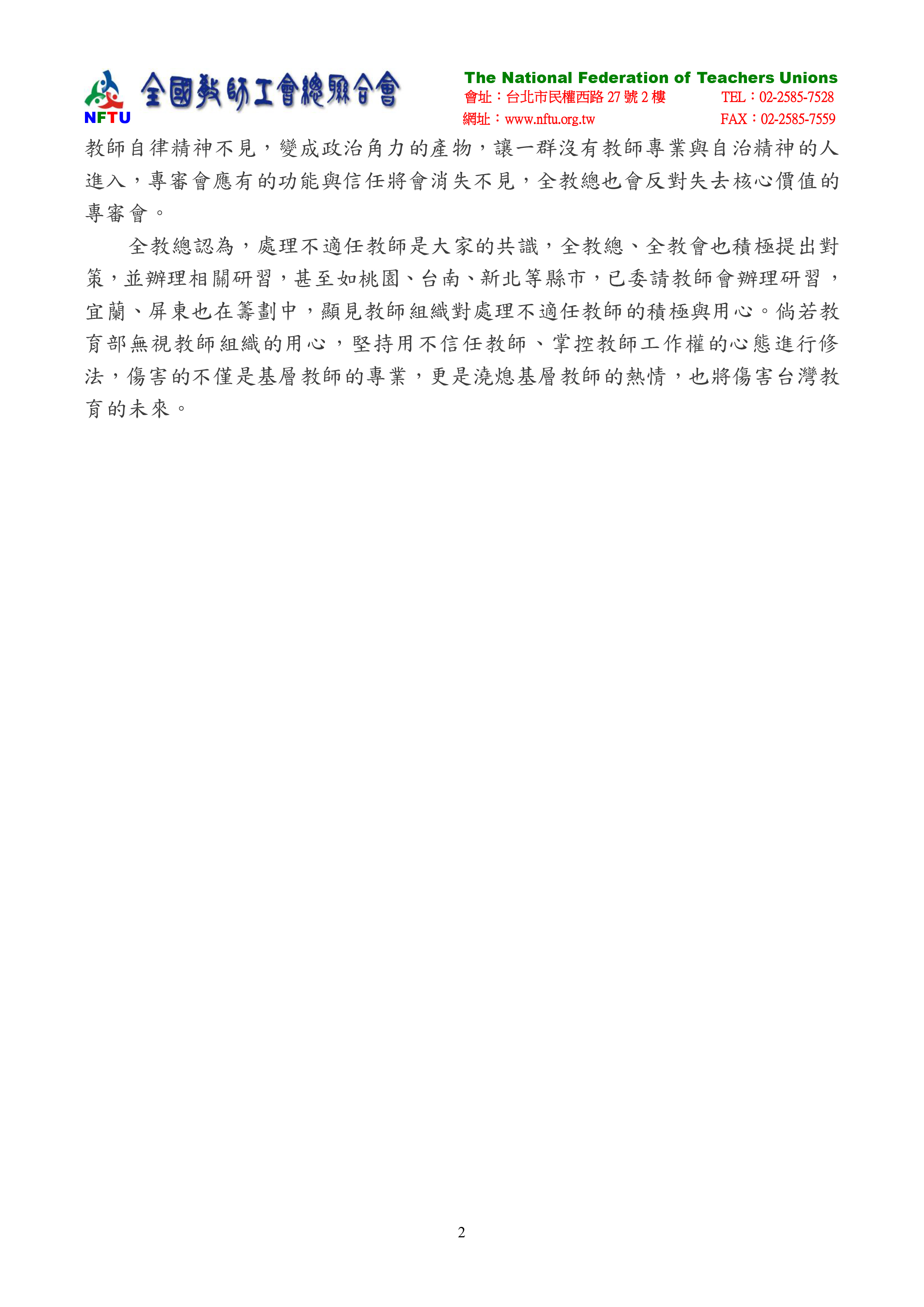 全教會認為,處理不適任教師是大家的共識,全教總、全教會也積極提出對策,並辦理相關研習,甚至桃園、臺南、新北等縣市,委請教師會辦理研習,宜蘭、屏東也在籌劃中,顯見教師組織對處理不適任教師的積極與用心。倘若教育部無視教師組織的用心,堅持用不信任教師、掌控教師工作權的心態進行修法,傷害的不僅是基層教師的專業,更是澆熄基層教師的熱情,也將傷害臺灣教育的未來。