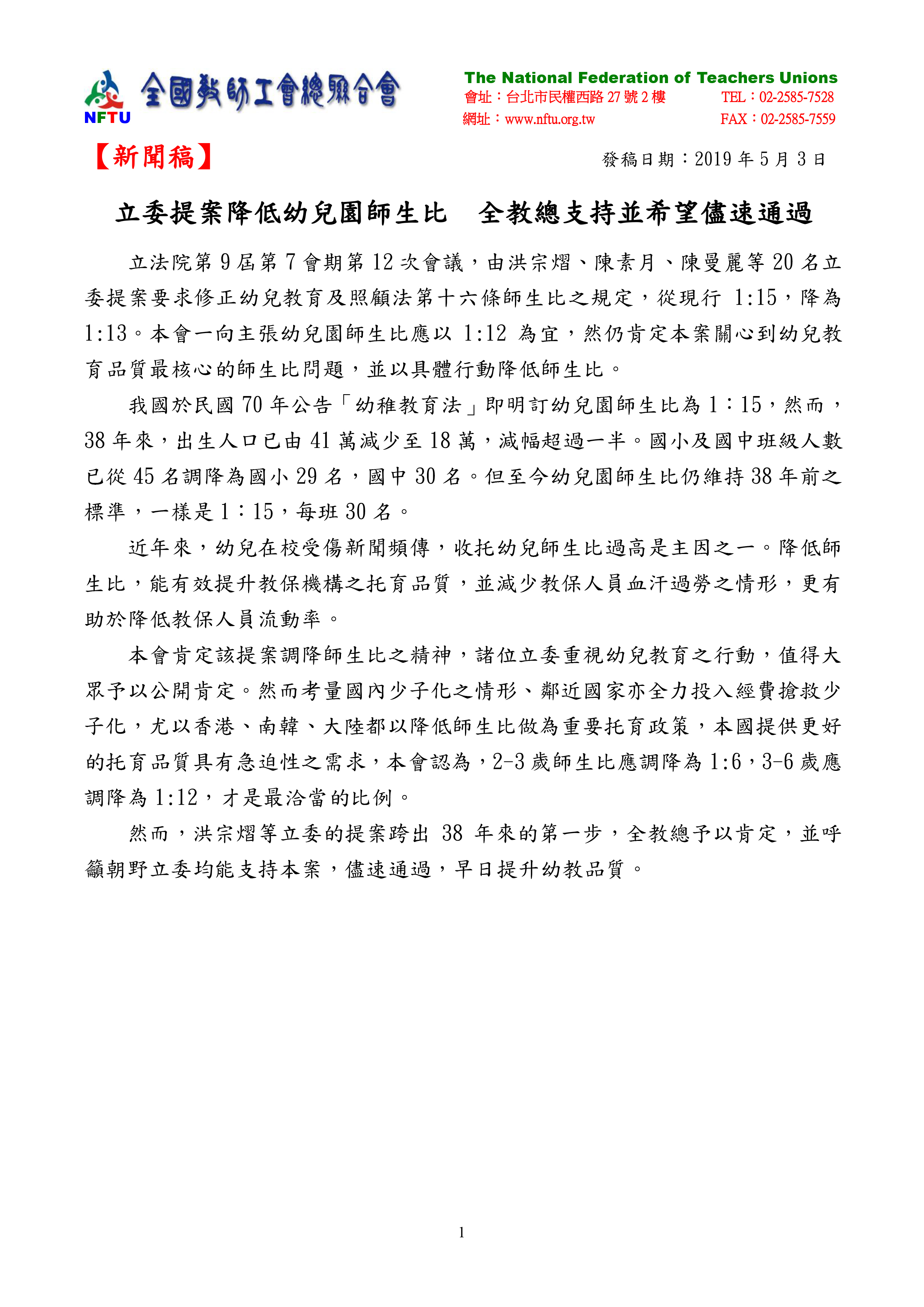 中華民國全國教師會(全教會)與全國教師工會總聯合會於2019年5月3日發佈新聞稿-立委提案降低幼兒園師生比,全教總支持並希望儘速通過,支持洪宗熠等20名立委提案要求修正幼兒教育及照顧法第十六條師生比之規定,從現行1:15,降為1:13。