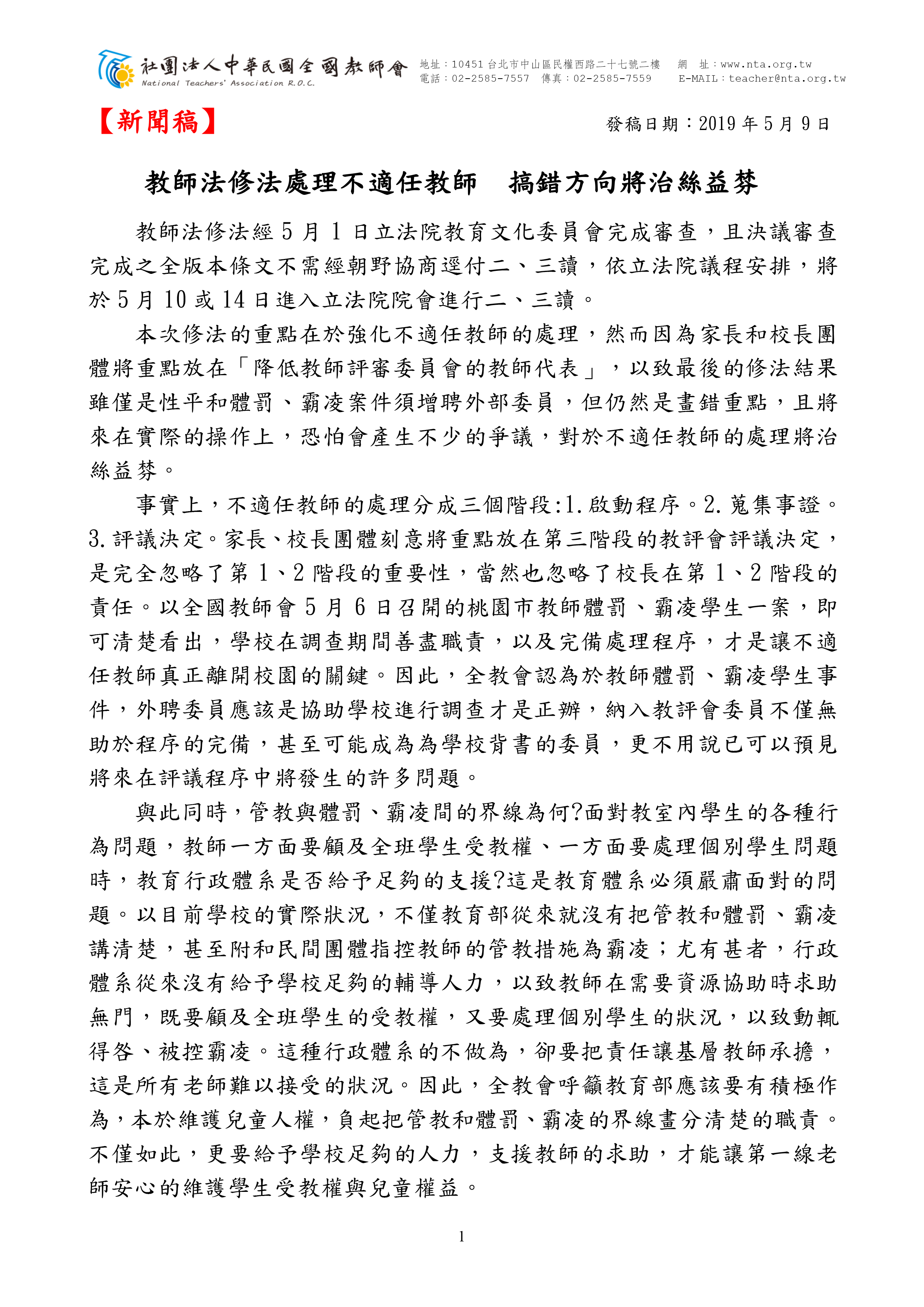 中華民國全國教師會(全教會)與全國教師工會總聯合會於2019年5月9日發佈新聞稿-教師法修法處理不適任教師,搞錯方向將治絲益棼,對教師法修法提出批判。