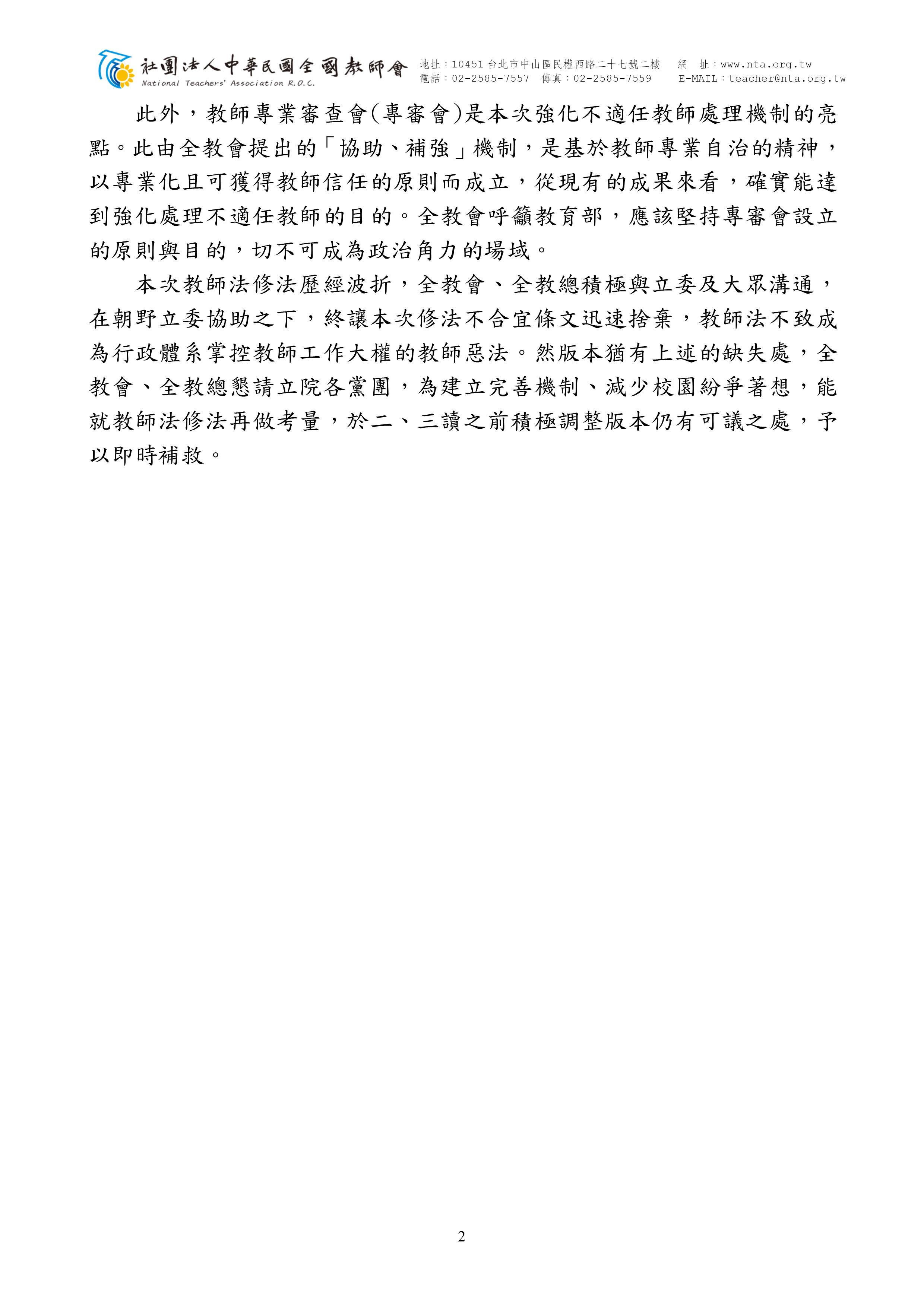 全教會表示,本次教師法修法歷經波折,全教會、全教總積極與立委及大眾溝通,在朝野立委協助之下,終讓本次修法不合宜條文迅速捨棄,教師法不致成為行政體系掌控教師工作大權的教師惡法。然版本猶有諸多缺失處,全教會、全教總懇請立院各黨團,為建立完善機制、減少校園紛爭著想,能就教師法修法再做考量,於二、三讀之前積極調整版本仍有可議之處,予以即時補救。