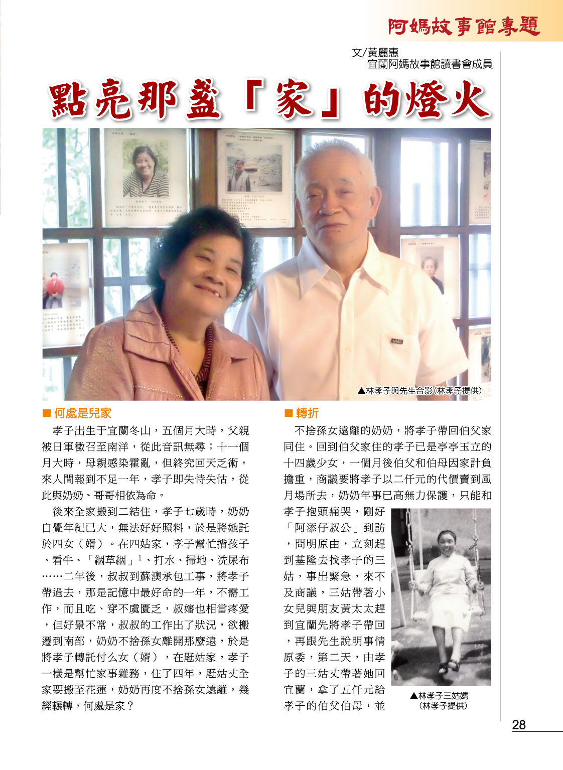 本文為黃麗惠所撰寫,描寫她的母親林孝子女士的生命故事。林孝子1943年出生于宜蘭冬山,五個月大時,父親被日軍徵召至南洋,從此音訊無尋;十一個月大時,母親感染霍亂,終究回天乏術,來人間報到不足一年,孝子即失恃失怙,七歲時,奶奶自覺年紀已大,無法好好照料,自此開始了四處漂蕩的寄宿。