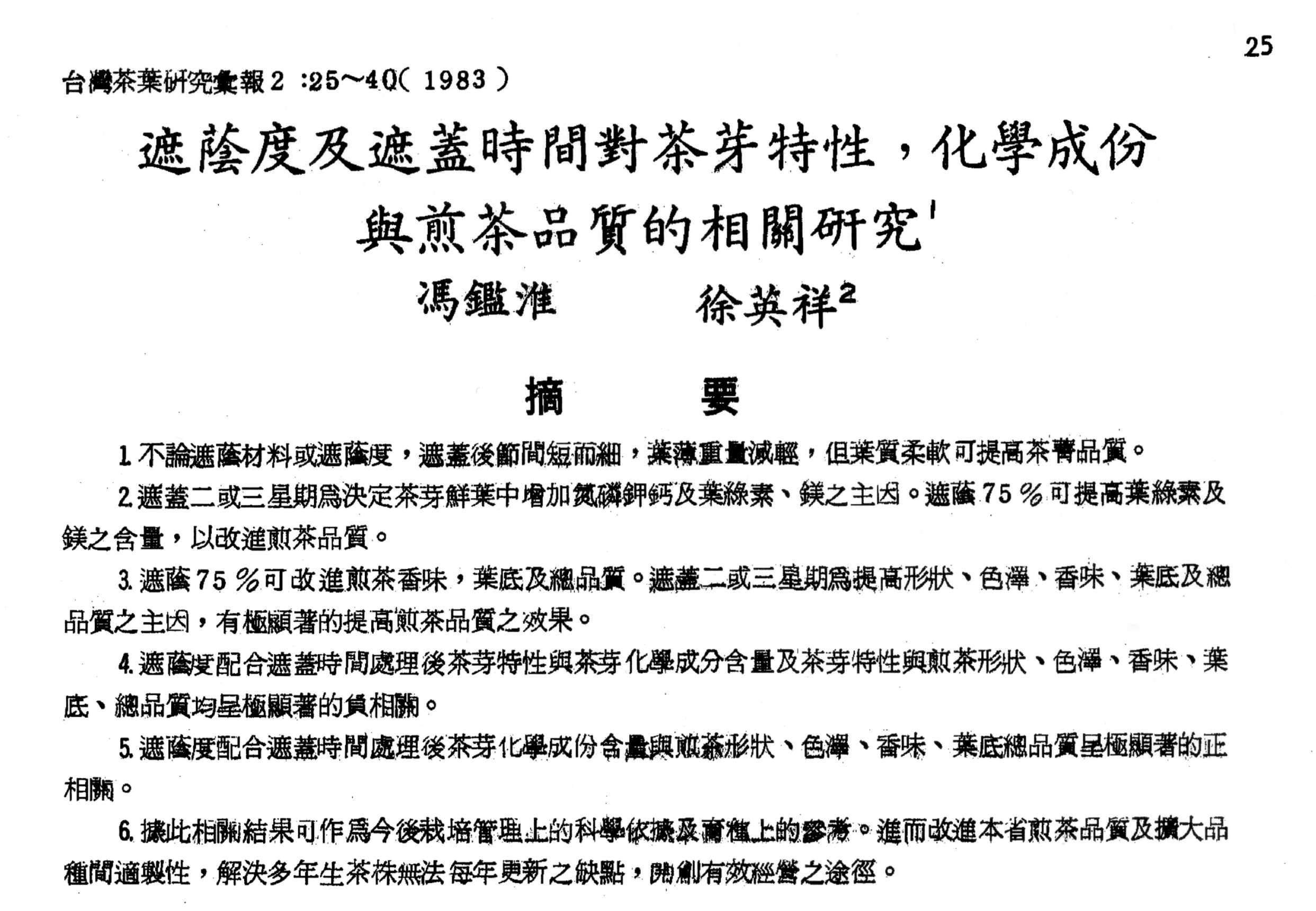圖為刊載於臺灣茶業研究彙報2卷,由馮鑑淮與徐英祥共同發表之「遮蔭度及遮蓋時間對茶芽特性,化學成份與煎茶品質的相關研究」研究論文。