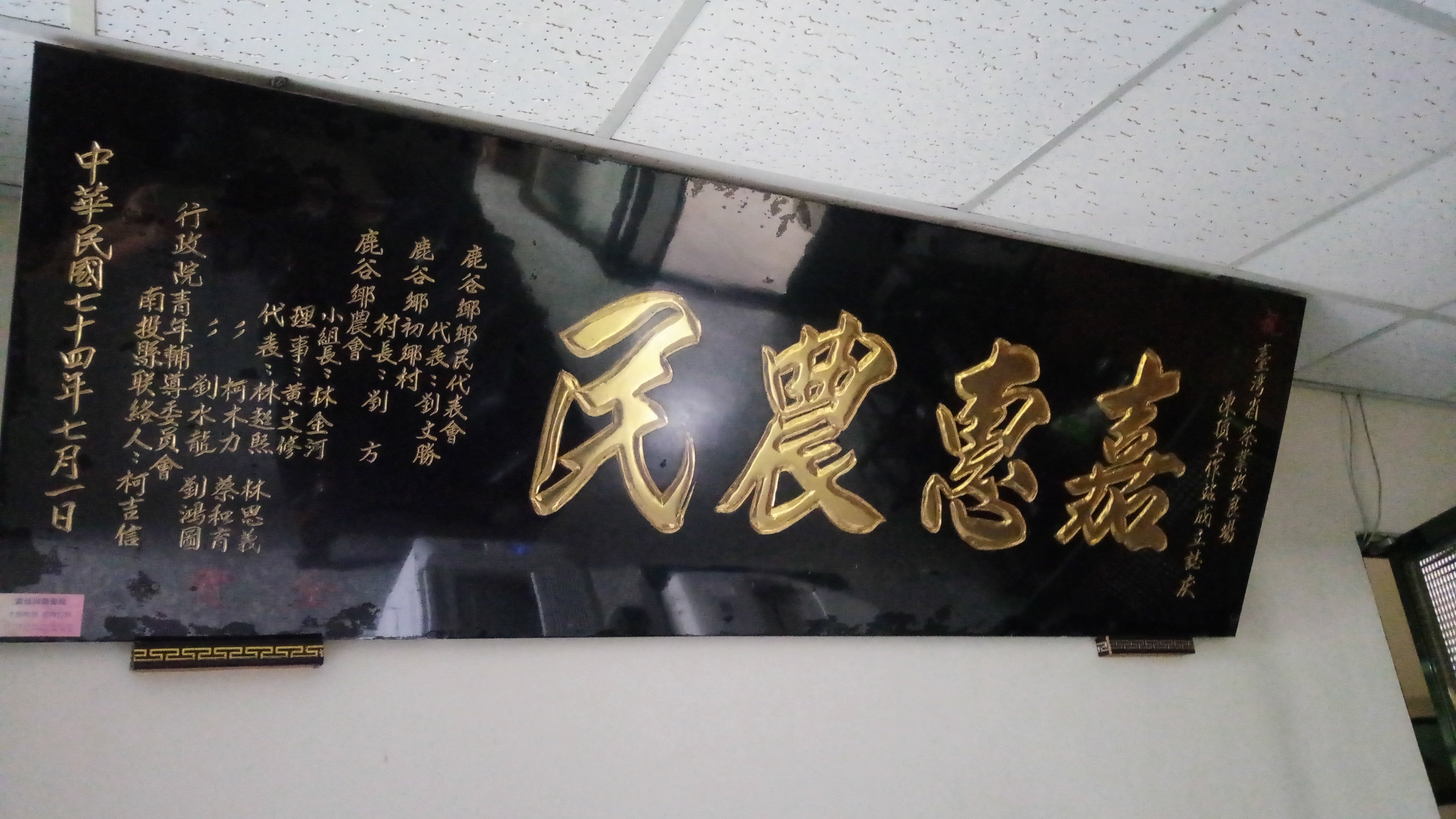 圖為鹿谷鄉民代表會、初鄉村、鹿谷鄉農會及行政院青年輔導委員會等於1985年(民國74年)7月1日致贈茶業改良場凍頂工作站成立誌慶之匾額,題字「嘉惠農民」,由鹿谷鄉民代表會代表為劉文勝、初鄉村村長為劉方、鹿谷鄉農會小組長為林金河、青年輔導委員會南投縣聯絡人為柯吉信致贈。
