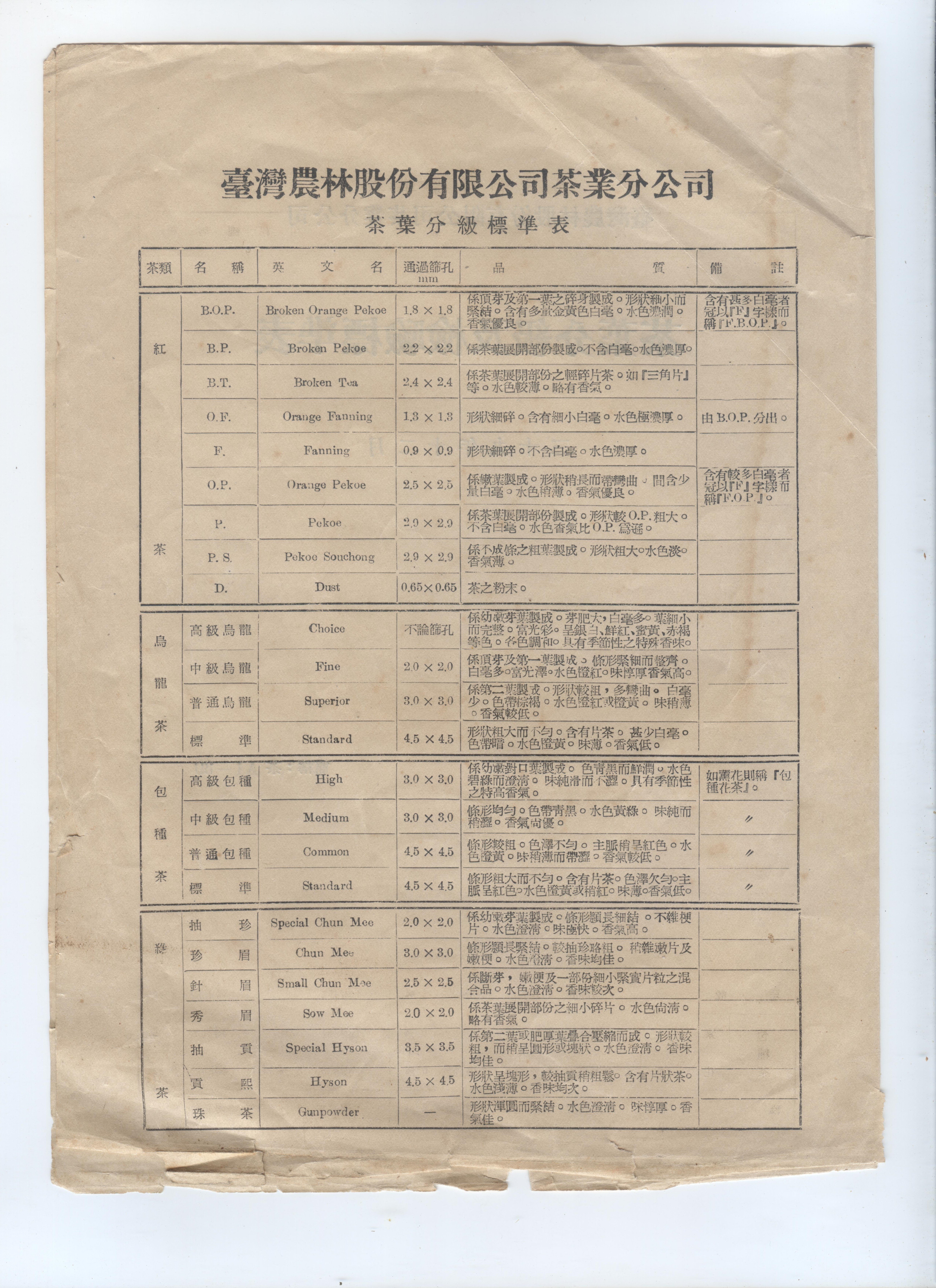圖為為臺灣農林股份有限公司茶葉分公司界茶葉分級及檢驗標準表,標準表之封面顯示時間為1950年(民國39年)12月,簡稱:茶A1-39,右下角有魚池分場員工楊守國之簽名。