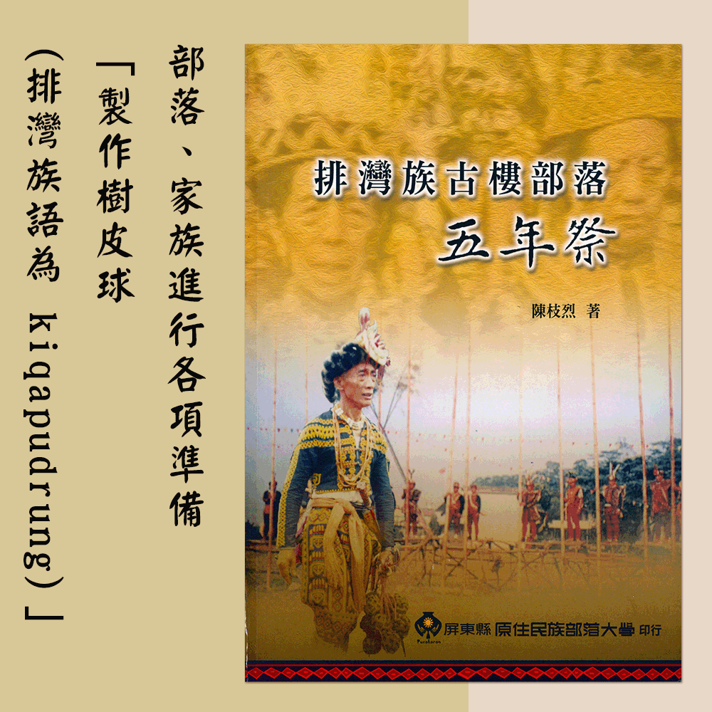 樹皮球是刺球活動會使用到的物品,需求量也相當多,通常也會提前製作。以古樓部落為例,在舊部落時期會使用相思樹(tjuqulj)樹皮製作樹皮球,但搬到新部落後,因相思樹的數量較少,構樹(quljicaca)的數量較多,現在則改以構樹製作樹皮球,但根據族人表示,用相思樹樹皮製作的樹皮球是比較堅韌耐用的。製作樹皮球的時程和製作竹竿的時程差不多,也是在祭典前的一至二個月進行,凡是要參加刺球活動的家族就要各自去砍伐樹木,取得樹皮,並處理成一條條長度約60至80公分的樹皮條。製作過程是先製作球心(venalisequc),取幾條樹皮互相打結結成一個圓形樹皮團(直徑約6公分),接著再用樹皮進一步勾繞,繞成球形(limitjelitj),一方面是要讓球體紮實,不會散開,另一方面是讓球體形狀更圓,一直勾繞到直徑約8公分時就完成了。