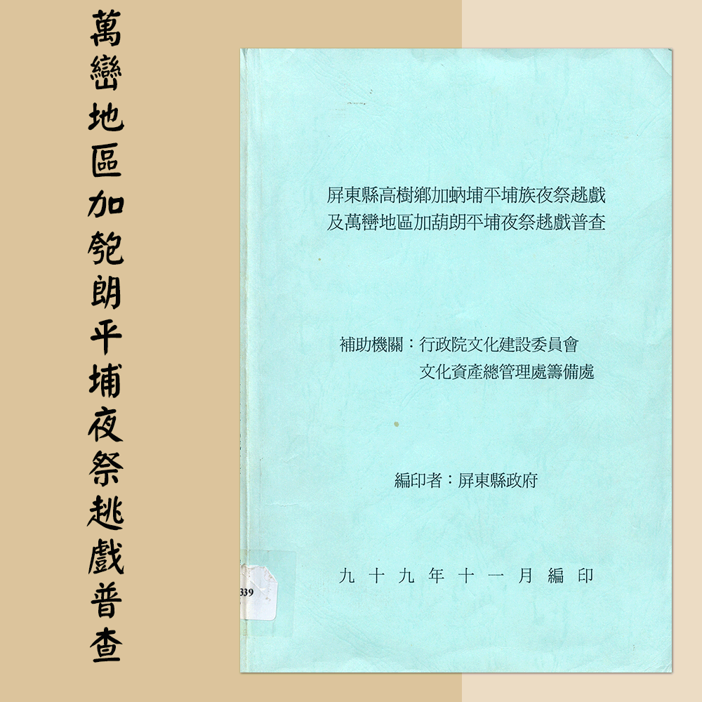 此篇取自〈屏東縣高樹鄉加蚋埔平埔族夜祭趒戲及萬巒地區加匏朗平埔夜祭趒戲普查〉本篇分為三個章節,加匏朗位處在山腳地區,這聚落的居民被學者認為是平埔族群的馬卡道人,是原居住於屏東平原鳳山八社的後裔,馬卡道族人的傳統儀式,從日治時期開始便紀錄流傳。藉由此紀錄可知夜祭中參與民眾的文化共識與認同,以建立地方平埔文化特色的觀念。加匏朗平埔族的夜祭特色有阿姆姆、仙女、馬哦嘮、豎竹篙、仙蛋供品、特殊法器-奇麟、雙槽與力社祈雨,共有八項特色。