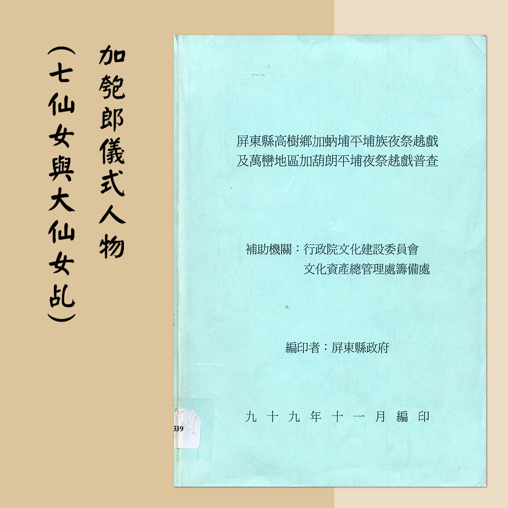〈屏東縣高樹鄉加蚋埔平埔夜祭趒戲及萬巒地區加匏朗平埔夜祭趒戲普查〉中敘述了進行夜祭祭典儀式時,有幾個重要的執行儀式的人物,分別為尪姨、曲頭、七仙女與大仙女乩、頭人、仙女。以下就七仙女與大仙女乩此儀式人物說明。七仙女原是仙姑祖廟旁七仙女的角色,在2003年農曆2月23日時,七仙女齊聚於仙姑廟,並獲得當時仙姑祖所偎乩的陳奶夫人乩身江秀梅女士的身分認可,而之後,大仙女乩也在當下以及往後數年的對內對外儀式上逐漸獲得身分認同,而成為夜祭祭典儀式中重要的儀式角色之一。