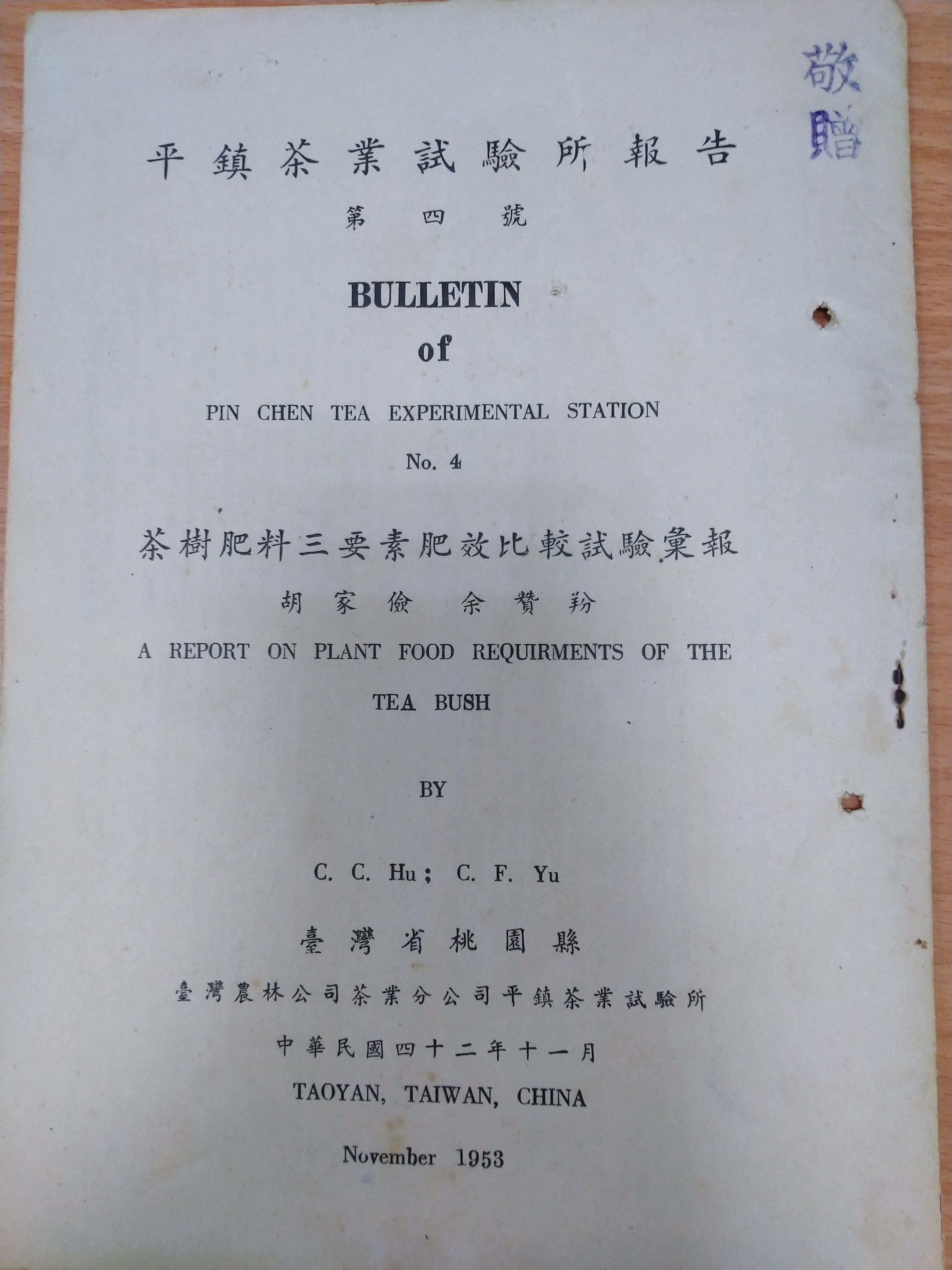「茶樹肥料三要素肥效比較試驗彙報」記載西元1910~1912、1917~1927及1930~1949年於臺灣農林公司茶業分公司平鎮茶業試驗所進行之茶樹肥料三要素施用試驗成果,試驗由前谷村愛之助、井上房邦及讚井元、林清水,諸氏主持,由胡家儉和余贊羒整理成篇報告。