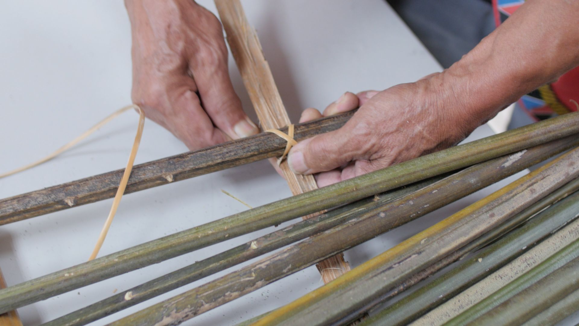 如圖,在這個步驟中,師傅必須拿上個步驟已經預留的剖半的黃藤擺在黑棕底下,並使用已經處理好的黃藤綁材,開始一個一個地慢慢將處理好的黑棕梗綁在剖半的黃藤上。綁的時候,黃藤必須十字交叉固定住黑棕才能使其穩固。此步驟與技術看似常見,實則非常考驗老師傅的手力與分配黑棕寬度的能力,這些能力有賴於豐富的經驗累積,必須在長期觀察及一再試驗下,才能迅速又順利的完成此步驟。