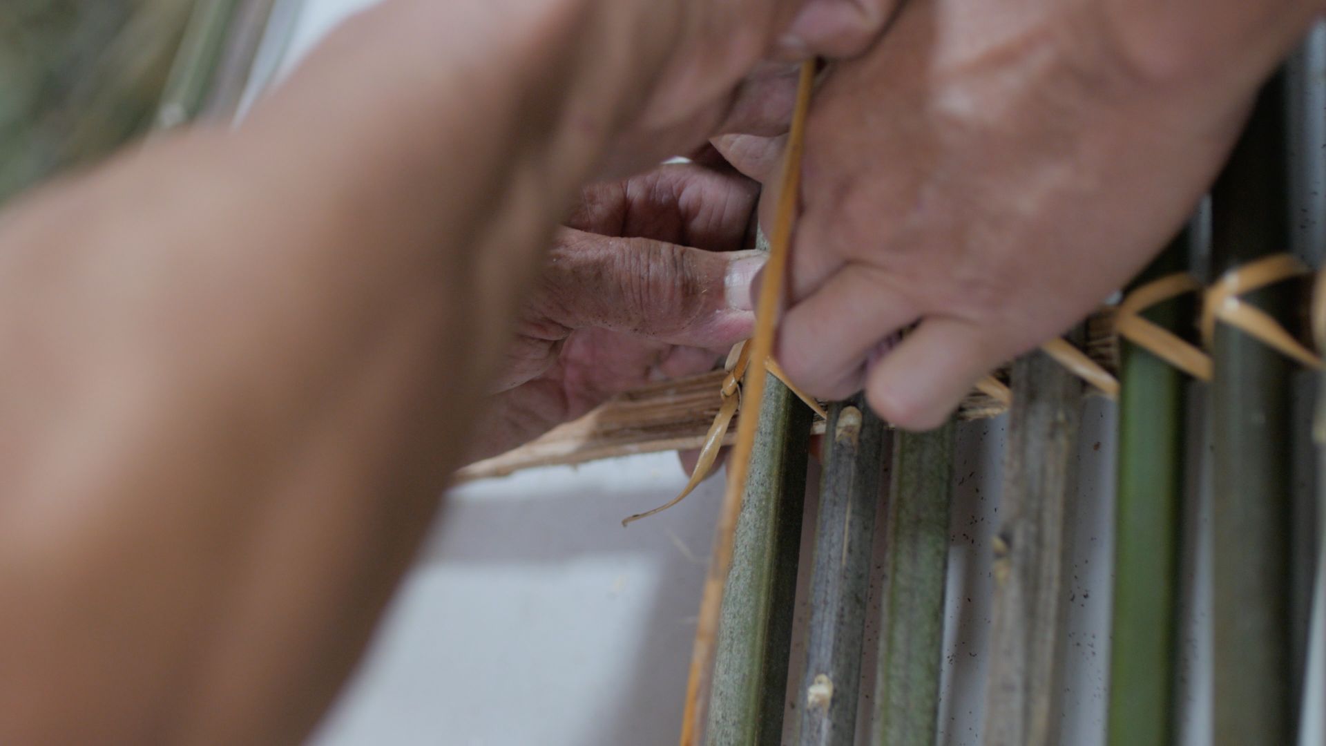 等檢查好大圈後,師傅就會開始將原本在綁黑棕的黃藤綁材收線。如圖片中所示,黃藤綁材的尾端會結束在最後一枝黑棕的旁邊。因為整個魚筌呈現漏斗狀,所以大圈黃藤上並不會全部都是黑棕,而是如圖片所看到的,結尾的黑棕和第一根黑棕中間會留一段空白的黃藤,如此設計除了是漏斗狀的功能外,當捕魚人要拿魚筌時,也可以拉固定好的黃藤空白處,使捕魚人方便拿取此漁具。為了要防止漁具在溪水中沖刷以及拿漁具時的磨擦,在黃藤綁材收尾時,必須特別小心其牢固度,才能確保擺放的漁具能發揮其功能。