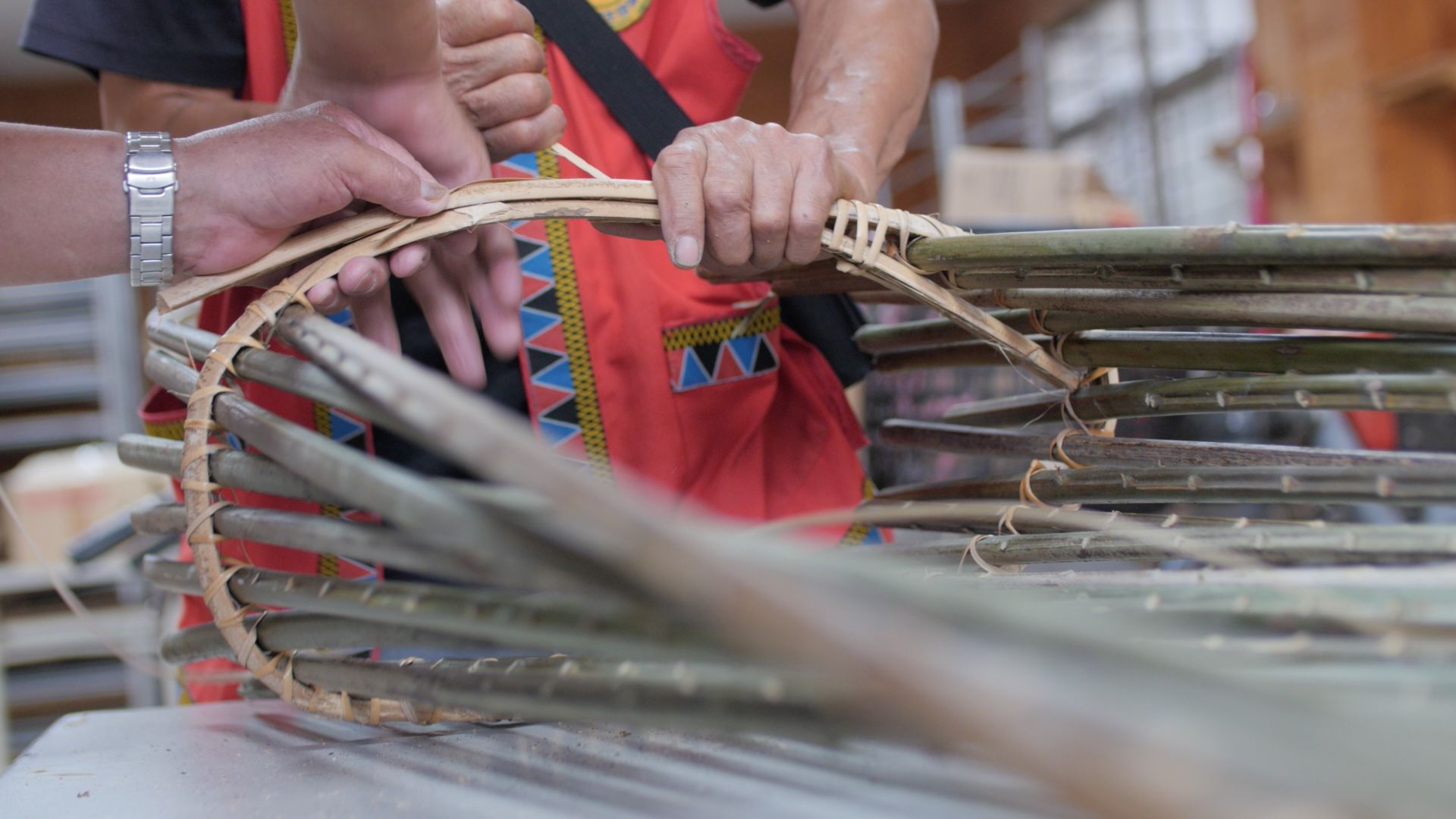 收完小圈的線材尾端後,師傅會回頭收魚筌上方大圈的黃藤。此步驟是將剛才已固定好線材的大圈黃藤收攏,並繼續使用黃藤綁材,將交疊的剖半黃藤綁緊。如圖所示,因黃藤彈力甚佳,光憑一位師傅的力量要完成固定相當費心費力,所以在此步驟時,若有人能從旁協助,幫忙壓著重疊的剖半黃藤,會讓師傅在綑紮上更加順利。這個步驟對於魚筌的外形與結構而言非常重要,綁好此段剖半黃藤後,魚筌的大致樣貌就已出現。