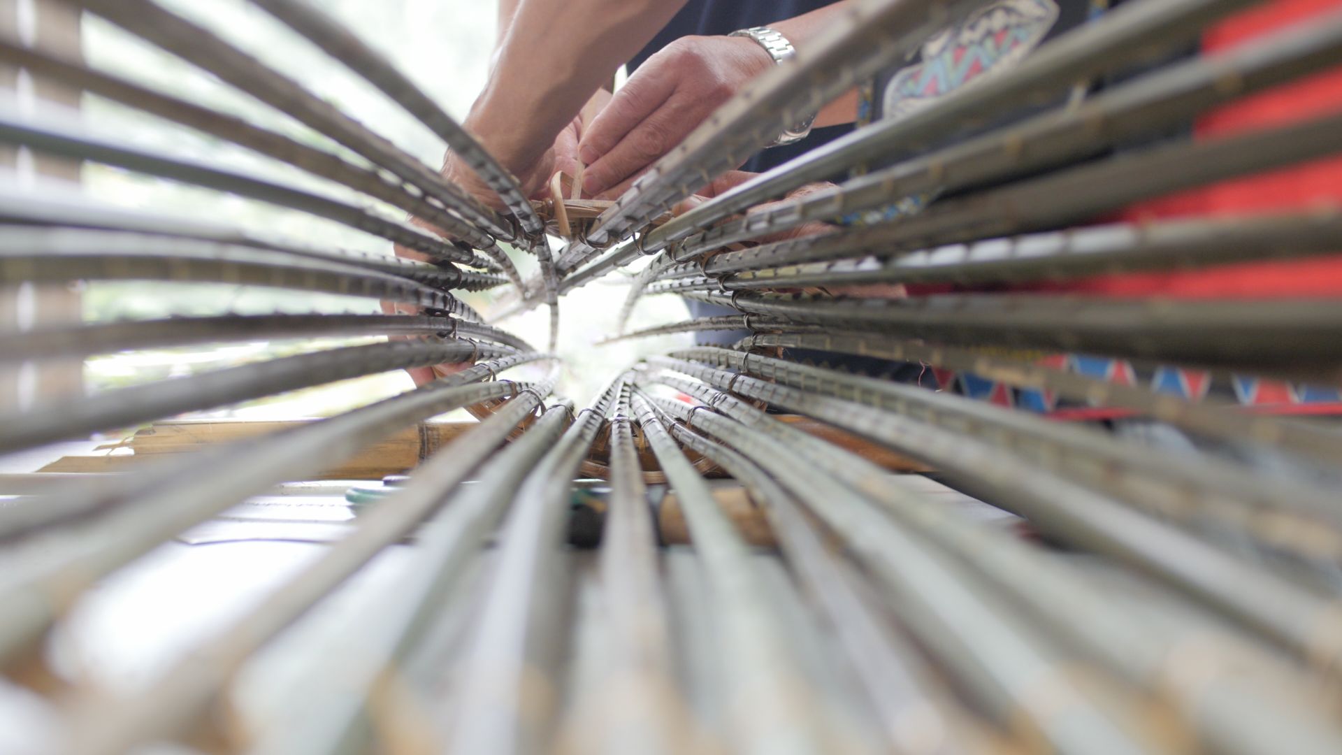 收完魚筌上方的大圈後,最後是下方的小圈收尾。小圈收尾大致和大圈相同,但仍有不少細節需要注意,確定與前面步驟的作工吻合,避免前功盡棄。此處必須確保黑棕是靠攏的、可以形成一個完整的圓圈樣貌。此處的大小還須考量要配合套筒的大小。因為套筒通常是竹子製成,或如下一張圖(圖20)是粗竹筒一體成型,所以變化圓圈直徑寬度較不易,需要在綁本體小圈的時候,就注意小圈與套筒的合適程度,師傅才不會需要重新做一次。