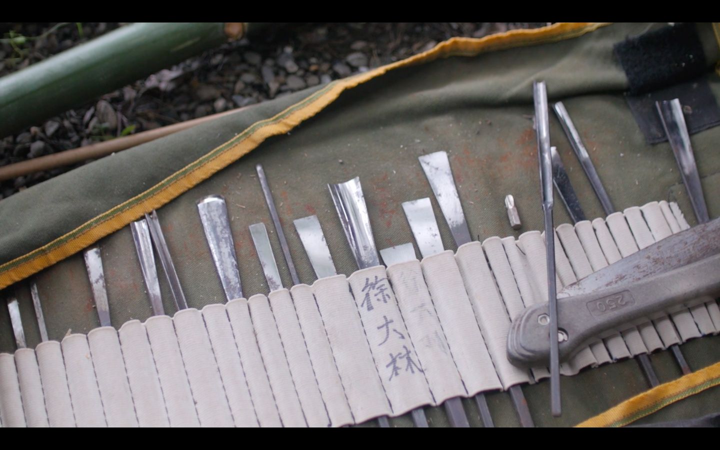 照片為徐大林師傅自己從年輕即開始使用的鑿刀組。鑿刀是做傳統工藝的重要工具之一,像是木工的基礎四工法是:鉋、鑿、鋸、磨,而做竹工藝品的基礎功雖然和木工不大相同,但同樣需要使用鑿刀製造銜接的切口、鑿洞或在竹上標記等等,各種鑿刀可說是缺一不可。徐師傅的鑿刀大小及樣式多種,裝備齊全,這些工具幫助他在製作相關工具,或者如現在教導其他學習者時,能更清楚地示範及展演傳統工藝製作過程。
