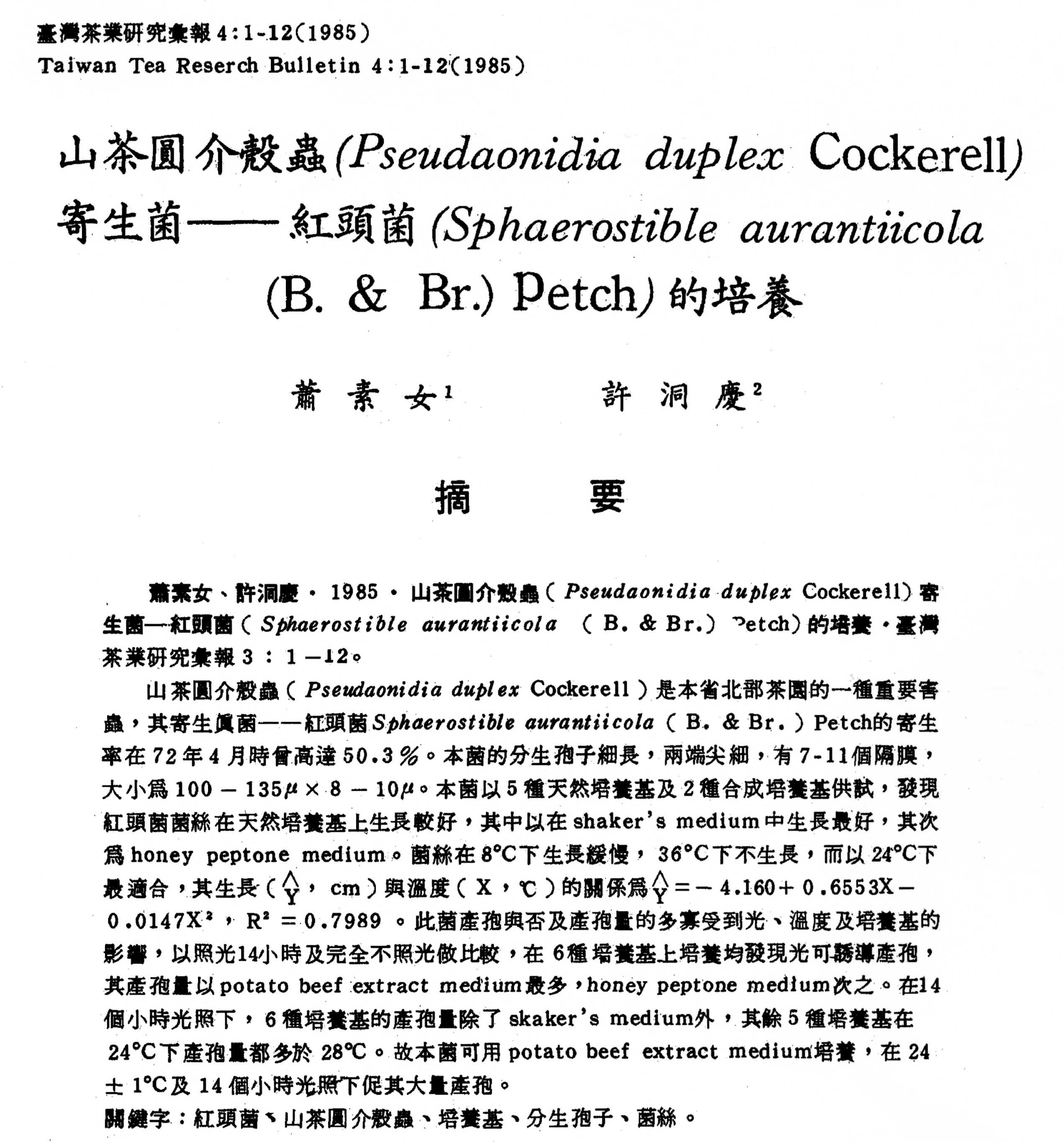 圖為刊載於臺灣茶業研究彙報4卷,由蕭素女與許洞慶共同發表之「山茶圓介殼蟲寄生菌-紅頭菌的培養」研究論文。