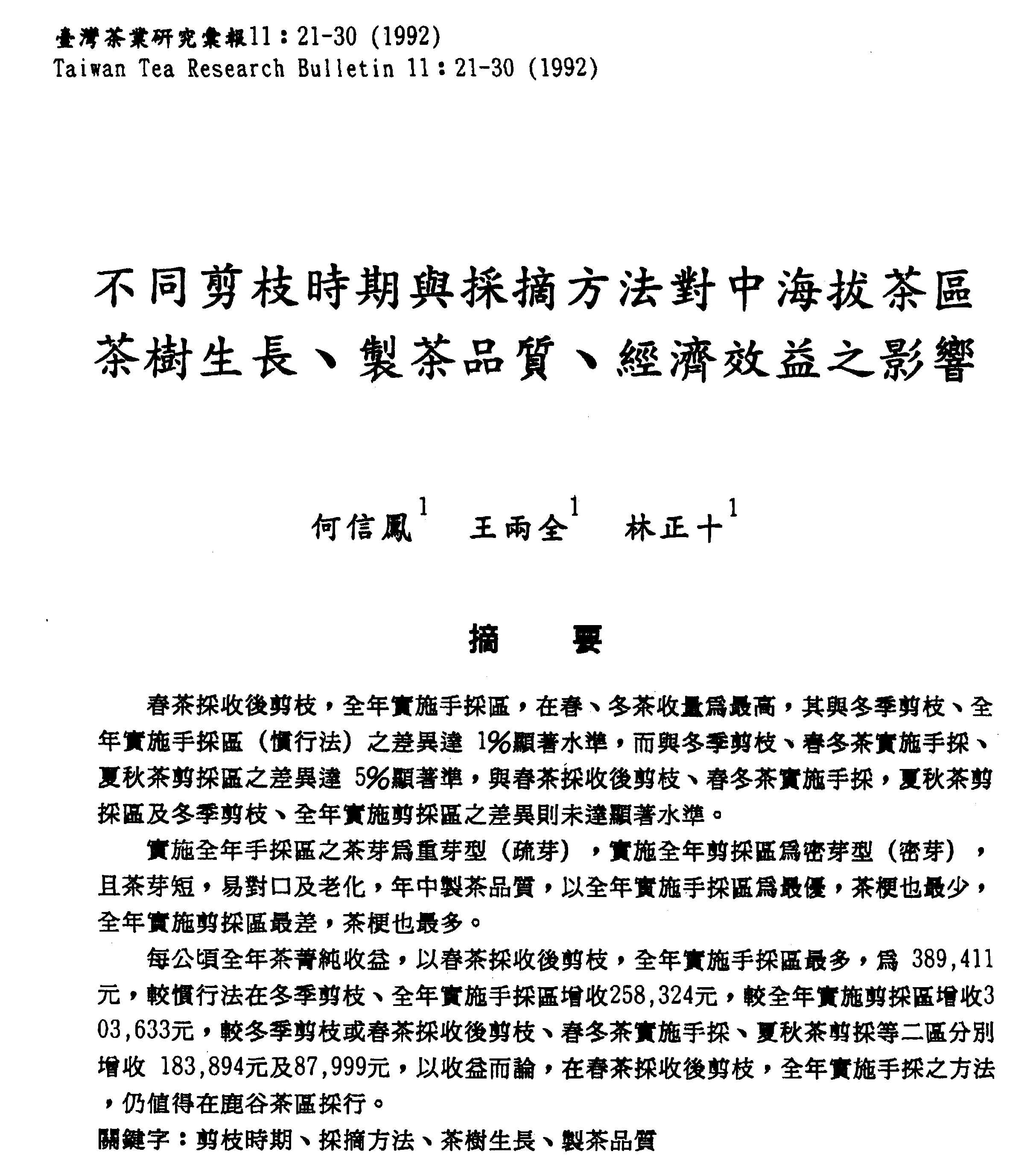 圖為刊載於臺灣茶業研究彙報11卷,由何信鳳、王兩全與林正十共同發表之「不同剪枝時期與採摘方法對中海拔茶區茶樹生長、製茶品質、經濟效益之影響」研究論文。