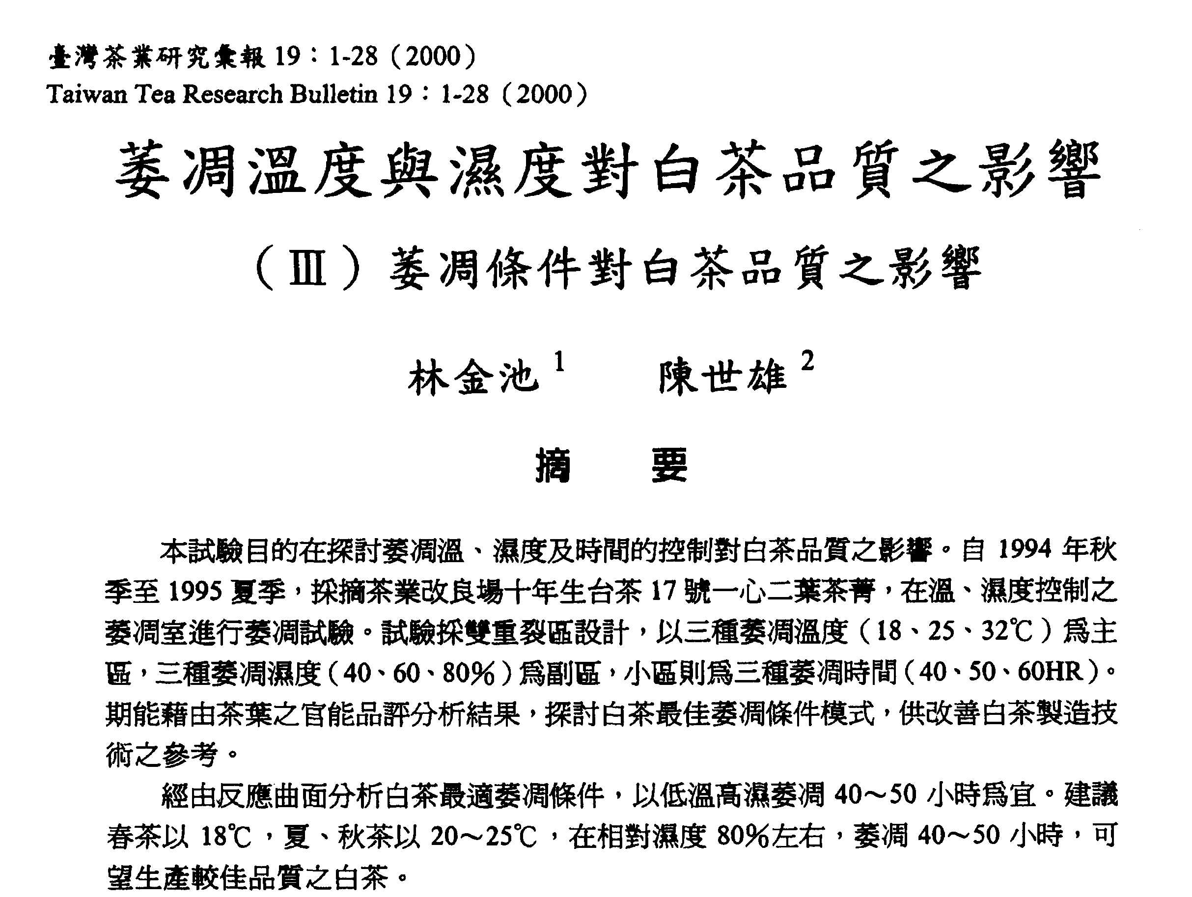 圖為刊載於臺灣茶業研究彙報19卷,由林金池與陳世雄共同發表之「萎凋溫度與濕度對白茶品質之影響(Ⅲ)萎凋條件對白茶品質之影響」研究論文。