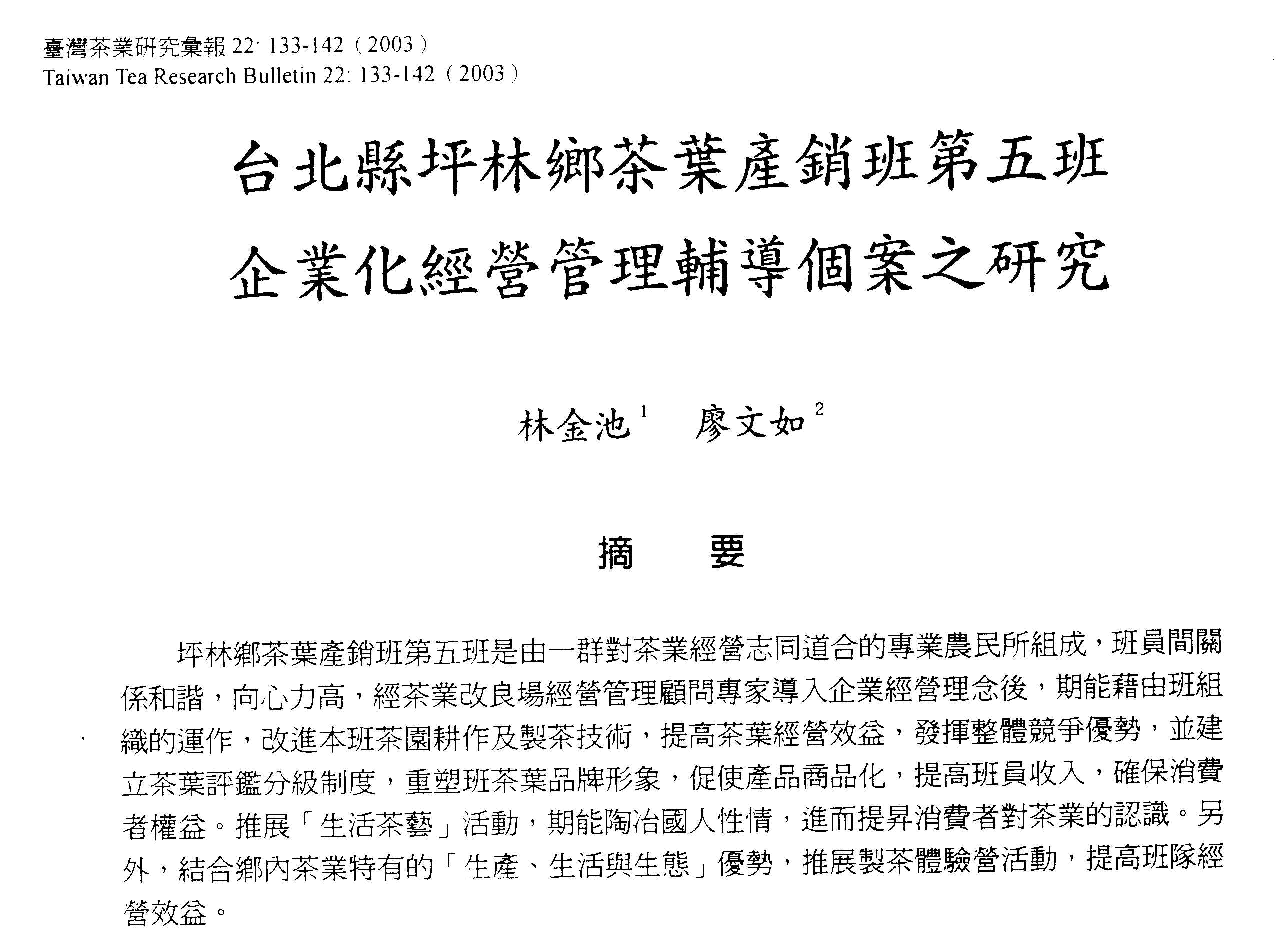 圖為刊載於臺灣茶業研究彙報22卷,由林金池與廖文如共同發表之「台北縣坪林鄉茶葉產銷班第五班企業化經營管理輔導個案之研究」研究論文。